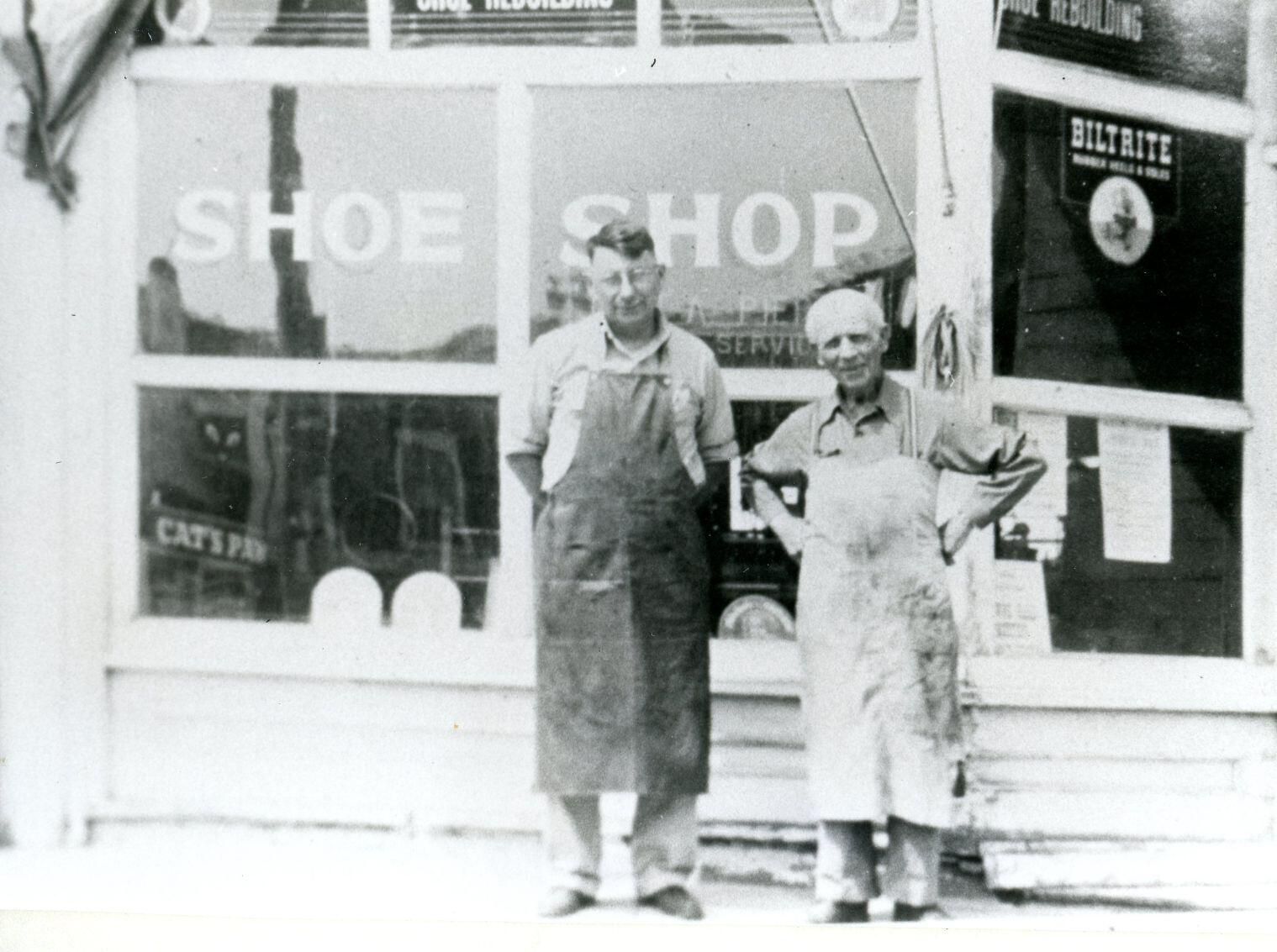 Pierson's Shoe Shop, St. Johns, in 1950's. Pictured are John Pierson and Frank Smith. Copy of photo used in Clinton County History (1980) page 681.