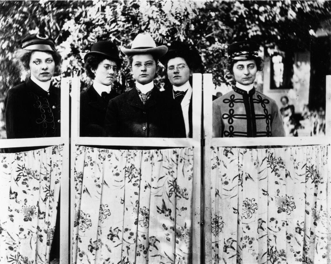 Dressed in George S. Pike's photographers clothes are Maud Randall Cutler, Agnes Pike Steinhardt, Ada Simmons Webb, Eva E. Simmons VanFleet, Edna Randall Pike [GSP90]Collection