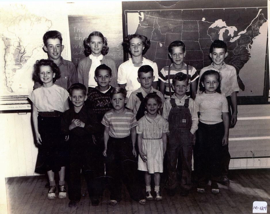 Plowman School, Riley Township, c1948-9. (row 1) Jim Cornell, Richard Hopp, Jackie Cornell, (row 2) Barbara Cornell, Gerald Smith, Harold Smalldon, Paul Plowman, Janet Stoy, (row 3) Dale Huguelet, Phyllis Plowman, Sharon March, Rowlan Smith, Jack Smalldon.