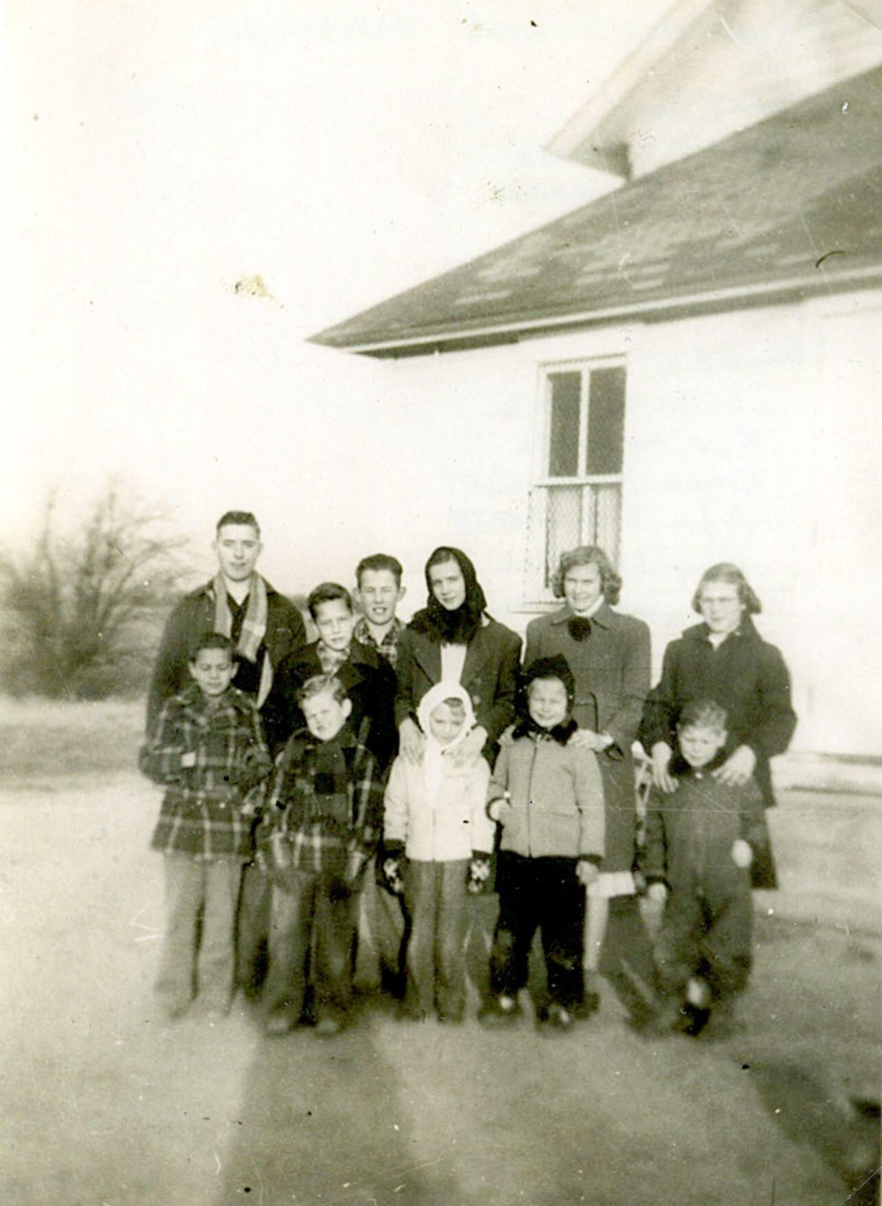 Plowman School, c1947-8. (front) Gerald Smith, Paul Plowman, -?-, Janet Stoy, Richard Hopp. (back) Leonard Race, Rowlan Smith, Dale Huguelet, Ada Sigafoose, Phyllis Plowman, Sharon March.