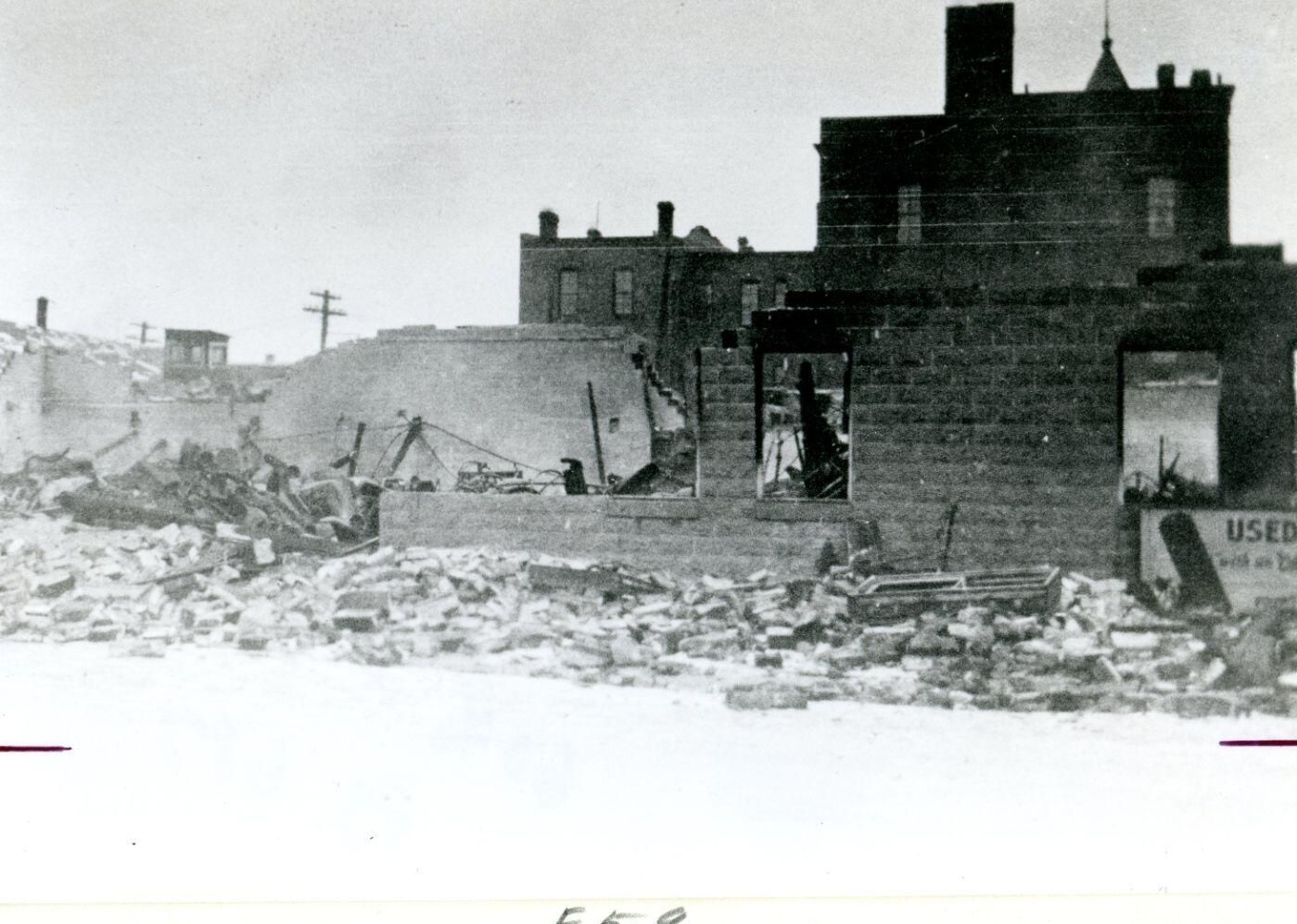 Pohl Brothers fire. Looking east toward Steel Hotel. Photo taken January 28, 1929. Copy of photo used in Clinton County History (1980) page 687. Another copy PI212-133.