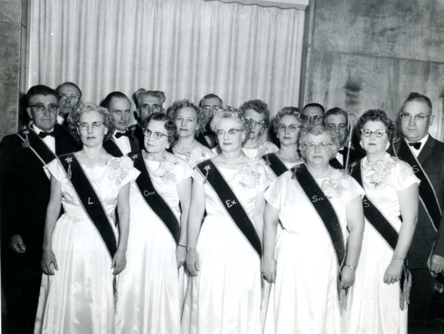 Pomona Grange Degree team. (front) Dorothy and Almond Cressman. (2nd row) Morrisons. (others) Glenn and Pearl Barnhart, Lee and Jean Cobb, Myrtle Salisbury.