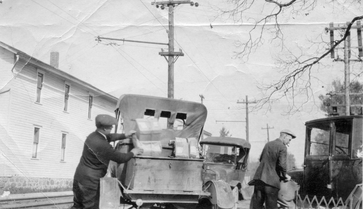 Mail carriers loading mail at Post Office/Interurban Depot on Franklin Street with Lewis Drake and Charles ReynoldsAcquisition
