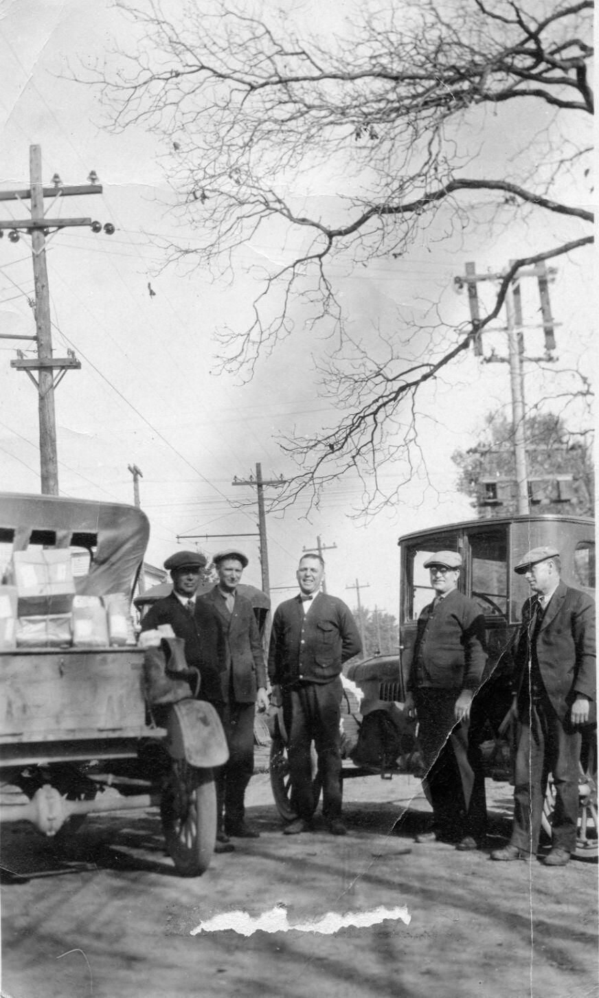 Post Office mail carriers Lewis Drake, Charles Reynolds, Carl VanFleet, Fred Hazel (postmaster), and Levi Sibley