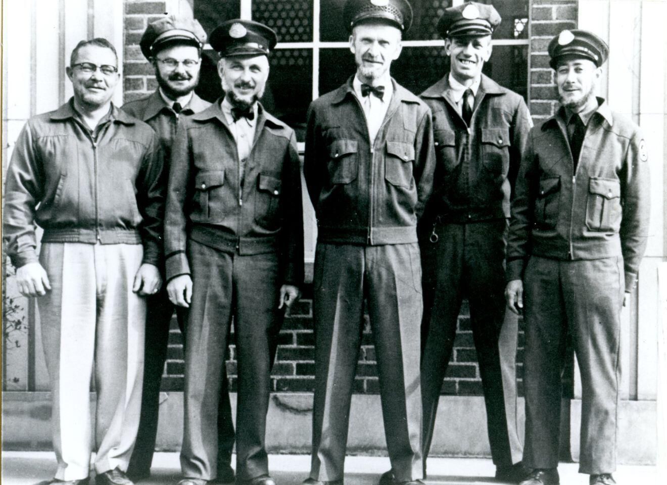 U. S. Post Office, St. Johns during centennial in 1956. Pictured are: Bill Knight, O. P. "Sonny" Estes, Bob Pratt, Warren Anderson, Jack Welton, and Ronnie Hyler. Copy of photo used in Clinton County History (1980) page 753. Additional copy PI212-193.