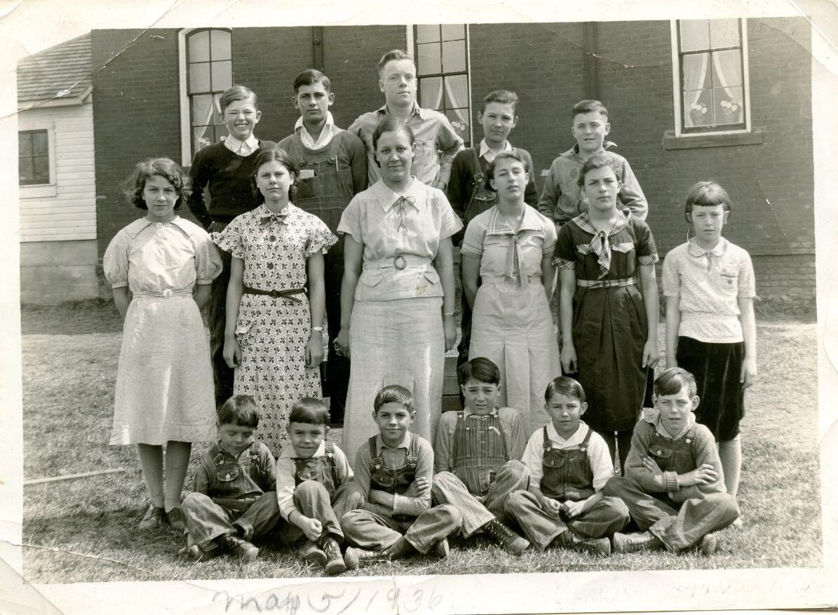 Prairie School, Essex Twp #1, (back) Carl Matter, Vern Ernst, Rodney Devereaux, Joe Michutka, Robert Devereaux, (middle) Lorraine Mills, Phyllis Olin, Carmelita Lietzke (teacher), Eleanor Dershem, Marjorie Dershem, Ellen Matter, (front) Victor Michutka, Vincent Michutka, Paul Michutka, Lester Dershem, Don Michutka, Gaylord Ernst. Taken May 5, 1936.
