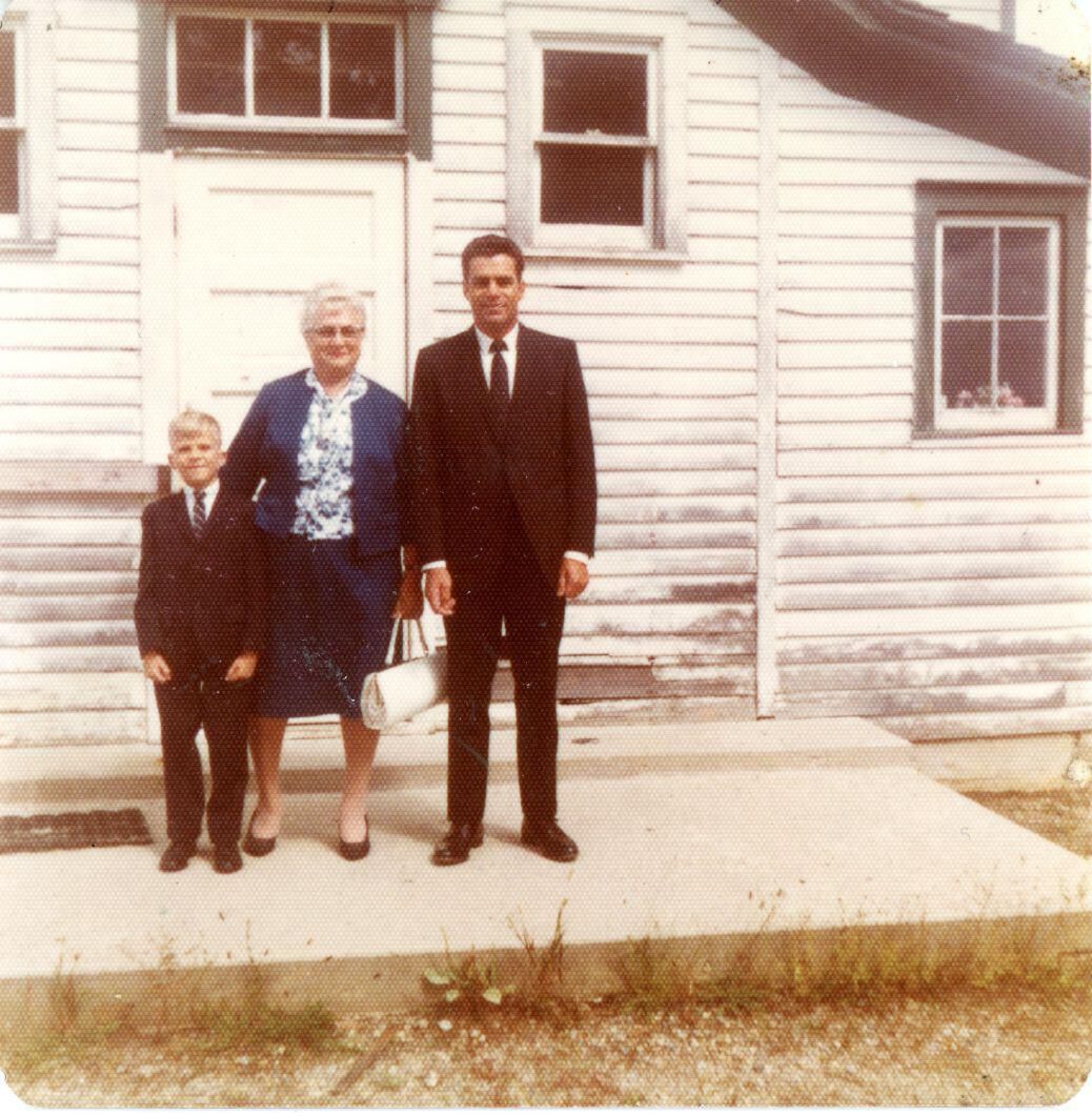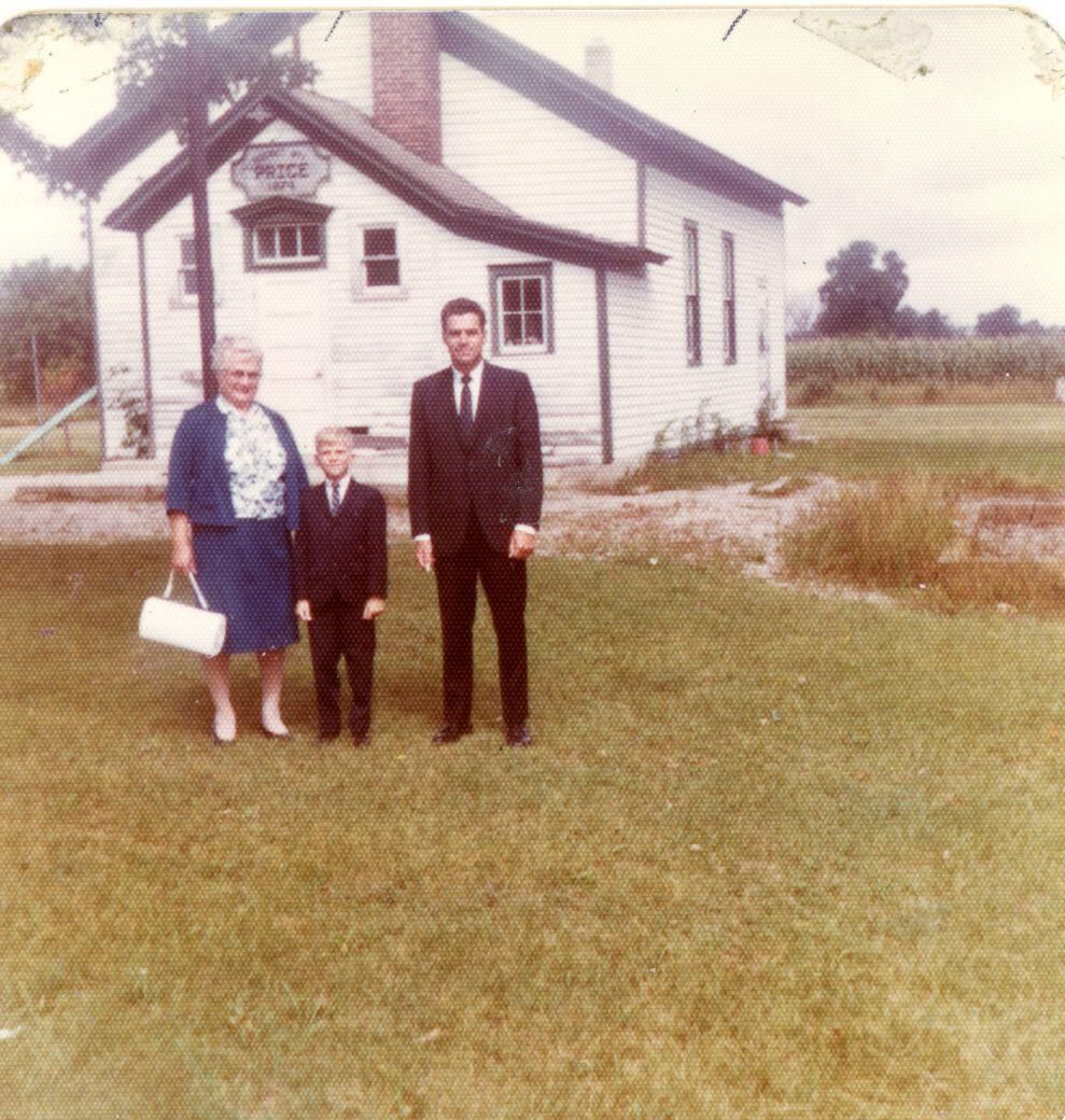 Agnes, Dana and Walter Viges standing in front of Price School in 1969. Agnes and Walter attended this school. There son Wayne who died in a car accident while in first grade also attended here.