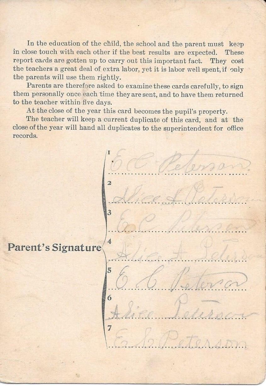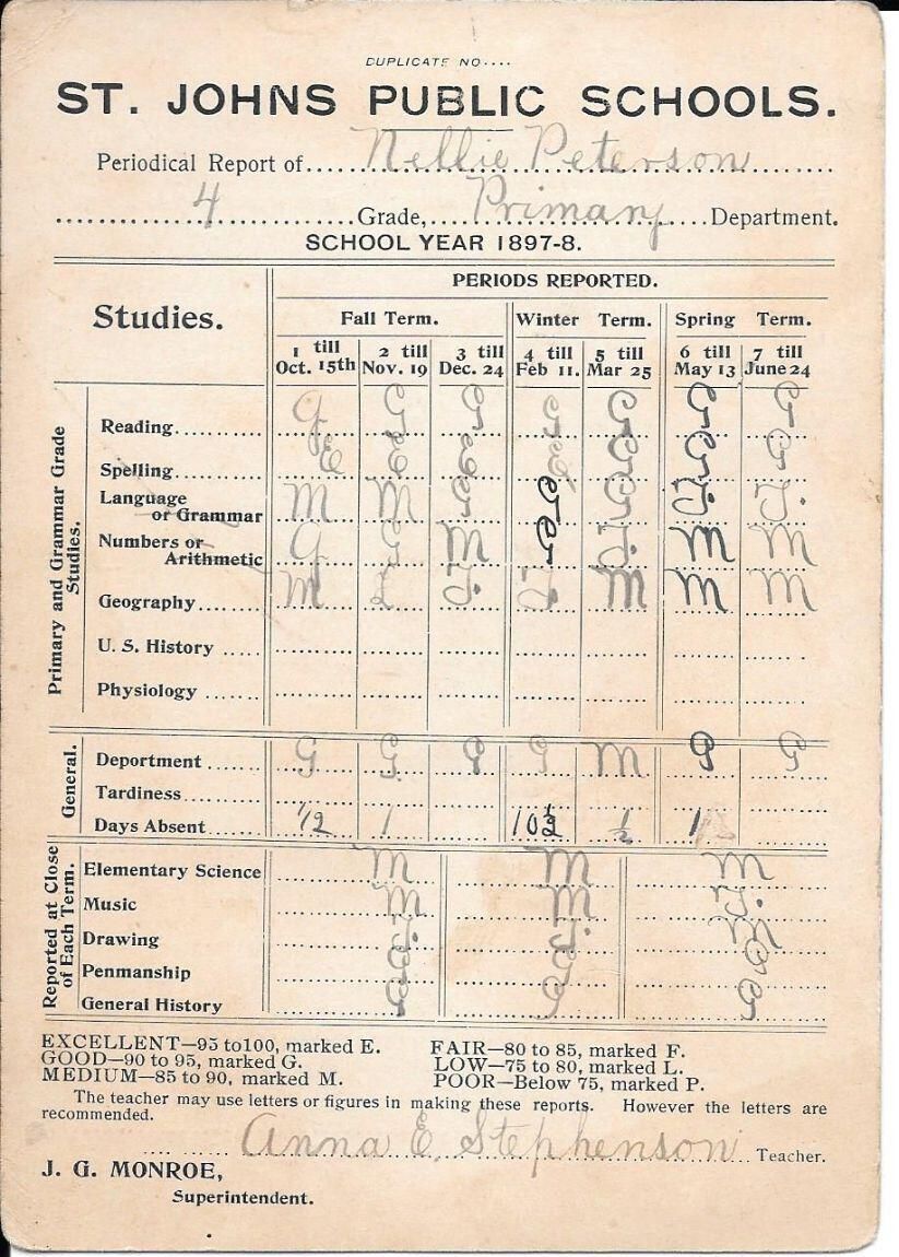 Nellie Peterson 4th grade report card from 1897-8, St. Johns Schools.