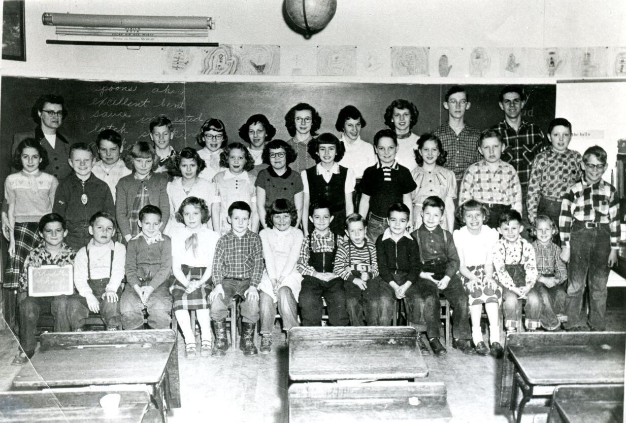 OLive Township's Rheubottom School's last class from 1953-1954. (front) Dale Farrier, Ronald Drumheller, Richard Mead, Jeananne Rayman, Dick Woodham, Raula Drumheller, Roger Leavitt, Marti Kingman, Lee Curtis, Jerry Weismiller, Linda Curtis, Donnie Griffith, Linda Ellis, (middle) Beverly Leavitt, Richard Arthur, Pauline Drumheller, Carla Farrier, Eileen Limburg, Sandra Hinbaugh, Marilyn Curtis, Phillip Morse, Sandra Limburg, Douglas Arthur, Billy Morse, Marvin Ball, (back) Jean Temple (teacher), Jeanette Boron, Marilyn Robbins, Janet Rayman, Allan Boron, Joe Rice. Copy of photo used in Clinton County History (1980) page 641. Original photo owned by Thelma Weismiller.