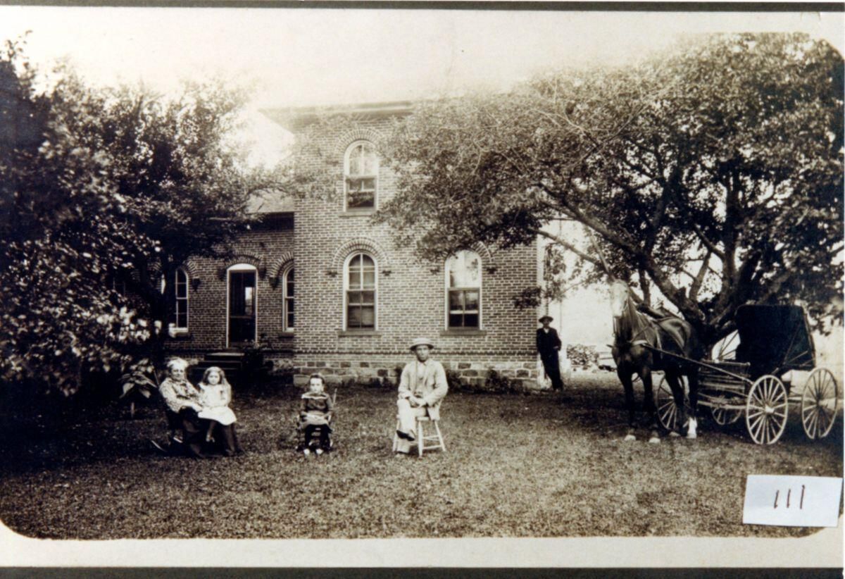 Blizzard farm home with Myrtie (Blizzard) Rhorere (holding) Marjorie Rhorer, Gladys Rhorer, and Henry Rhorer. copy