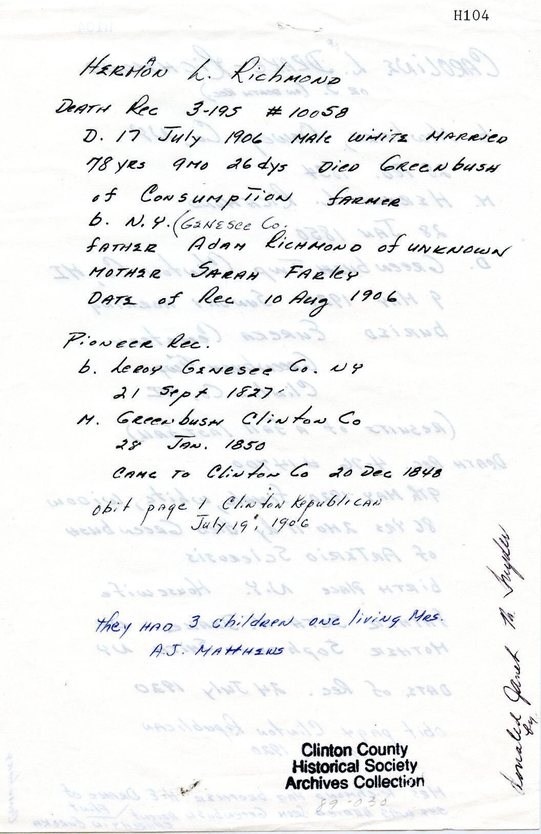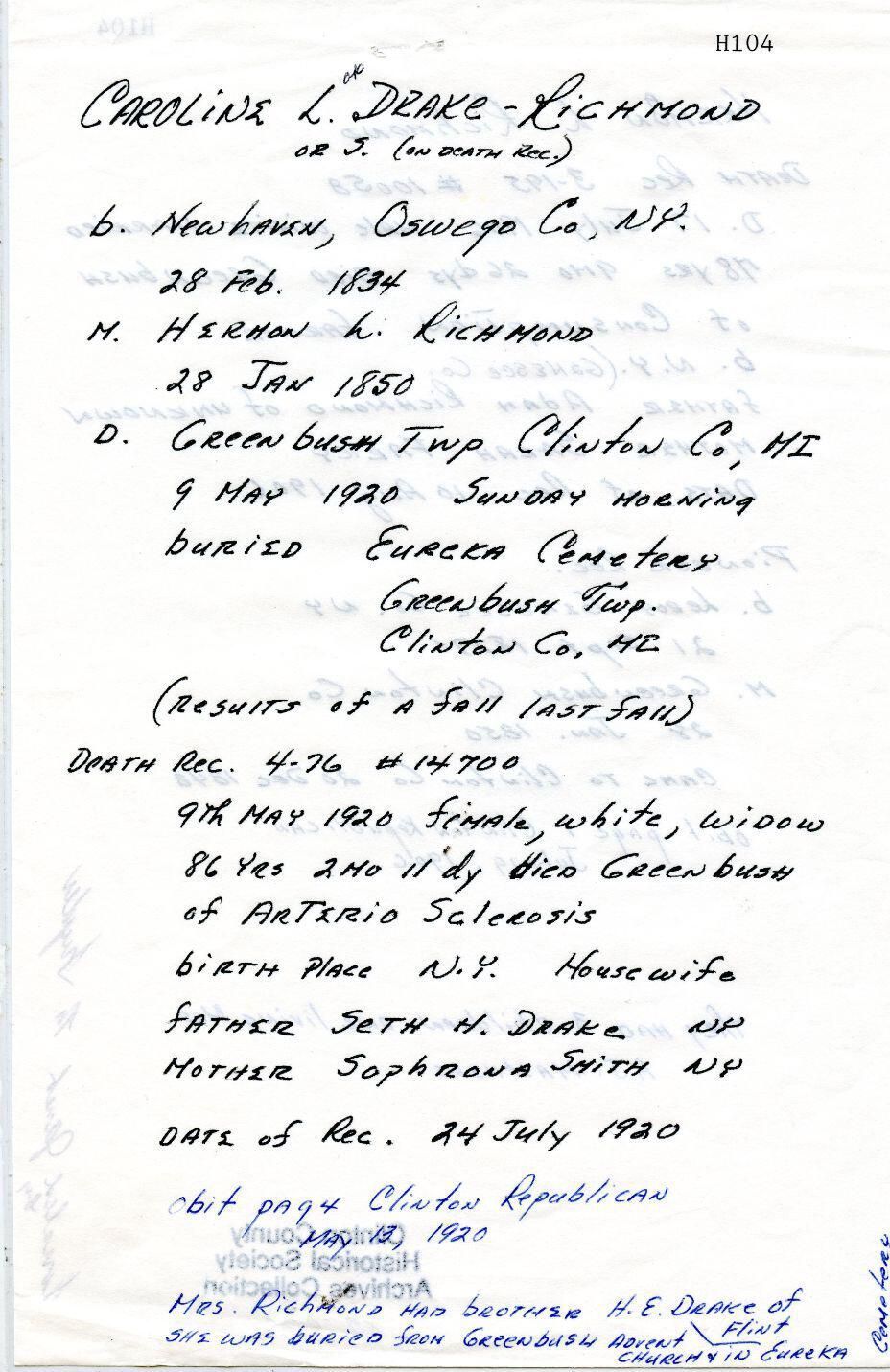 Caroline L. (Drake) Richmond, wife of Herman L. Richmond of Greenbush Township.