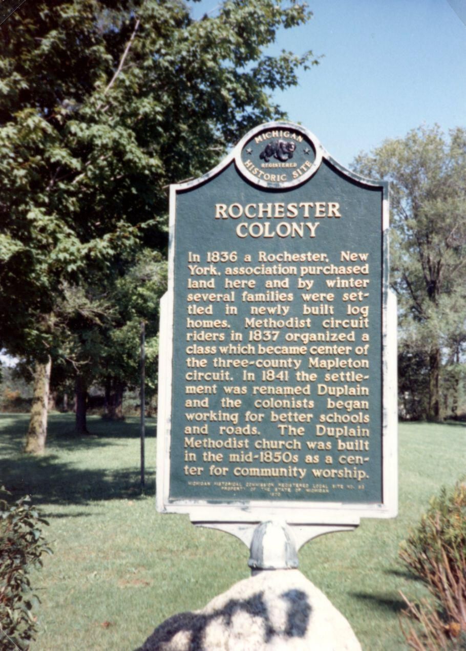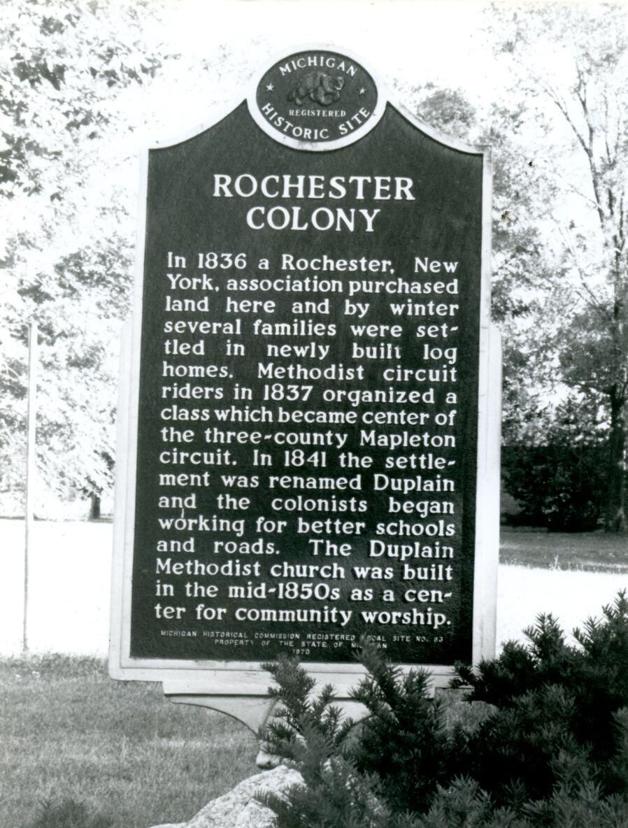 Michigan Historic Site marker for Rochester Colony. Copy of photo used in Clinton County History (1980) page 755. (also N-74)