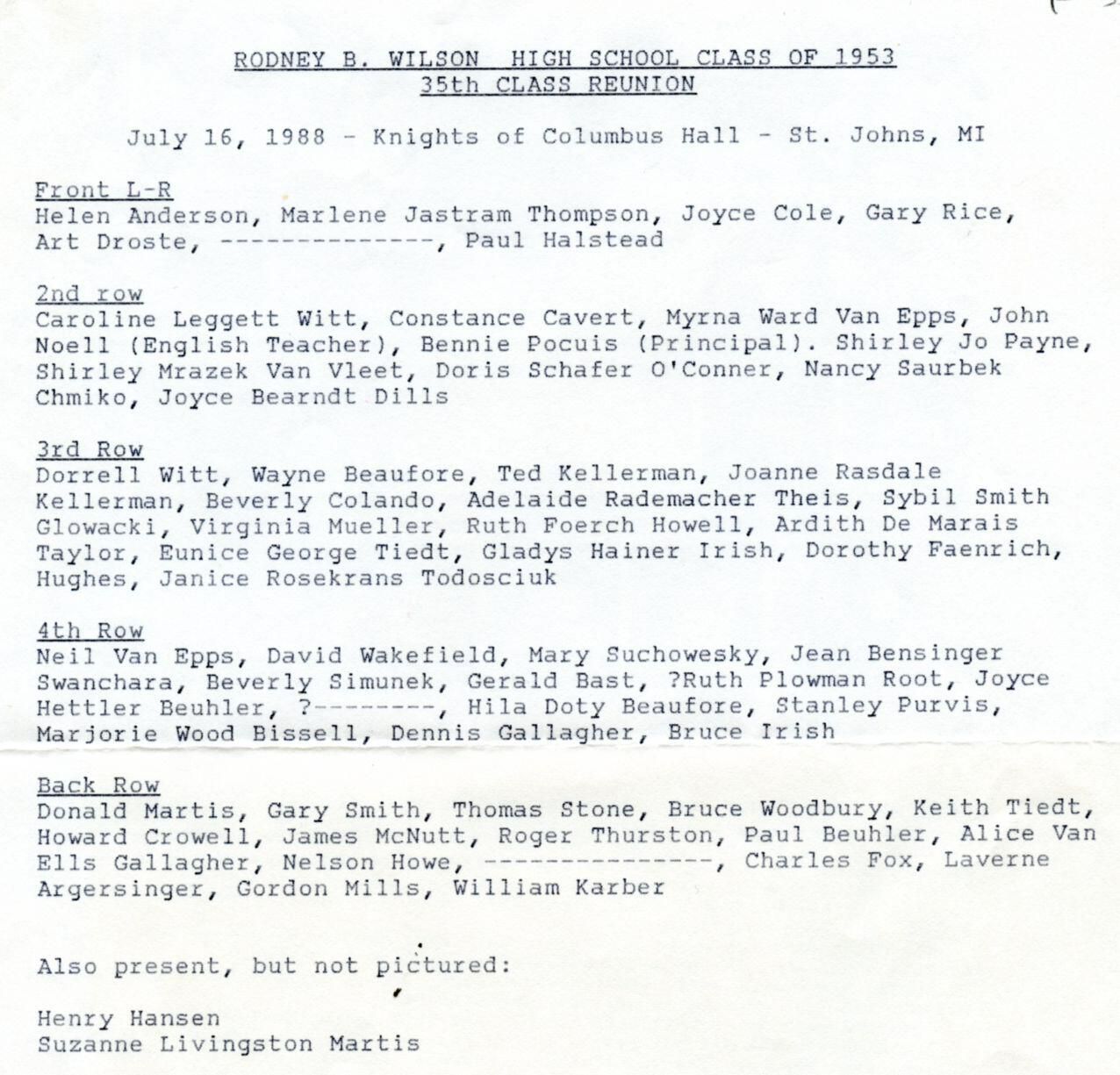 Rodney B. Wilson class of 1953 35th reunion on July 16, 1988.