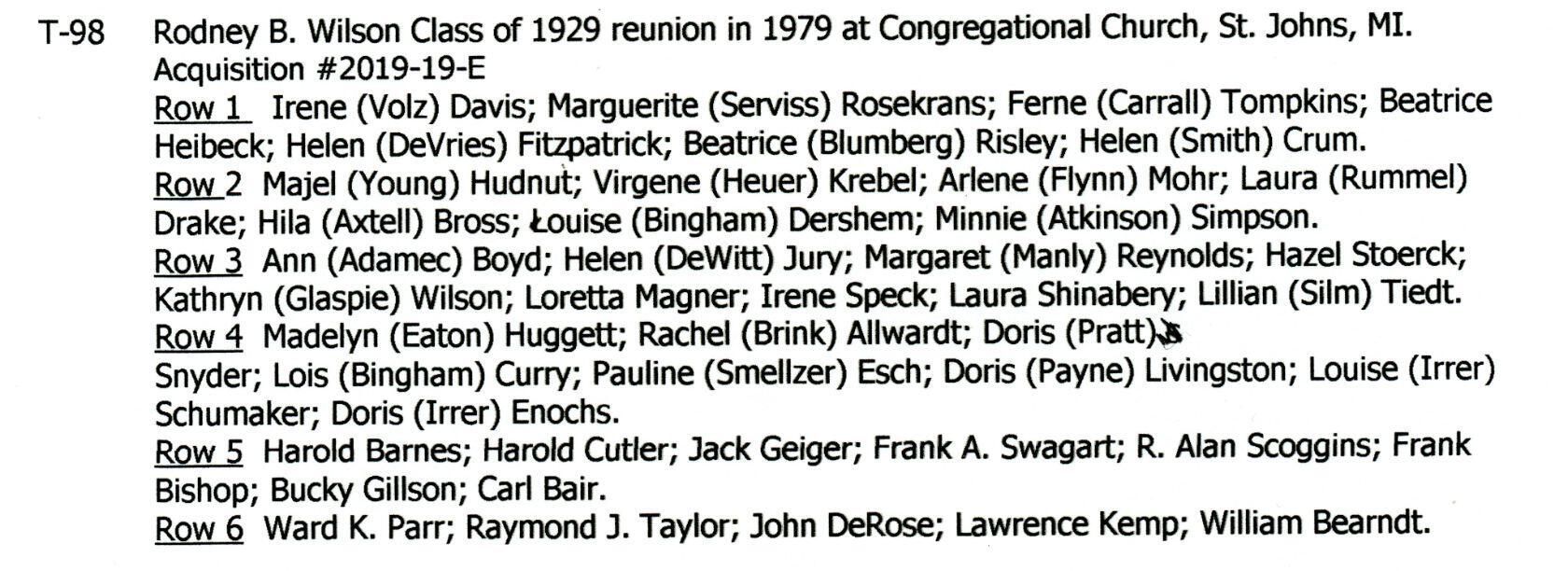 Rodney B. Wilson class of 1929 60 year reunion. 1979 at St. Johns Congregational Church.