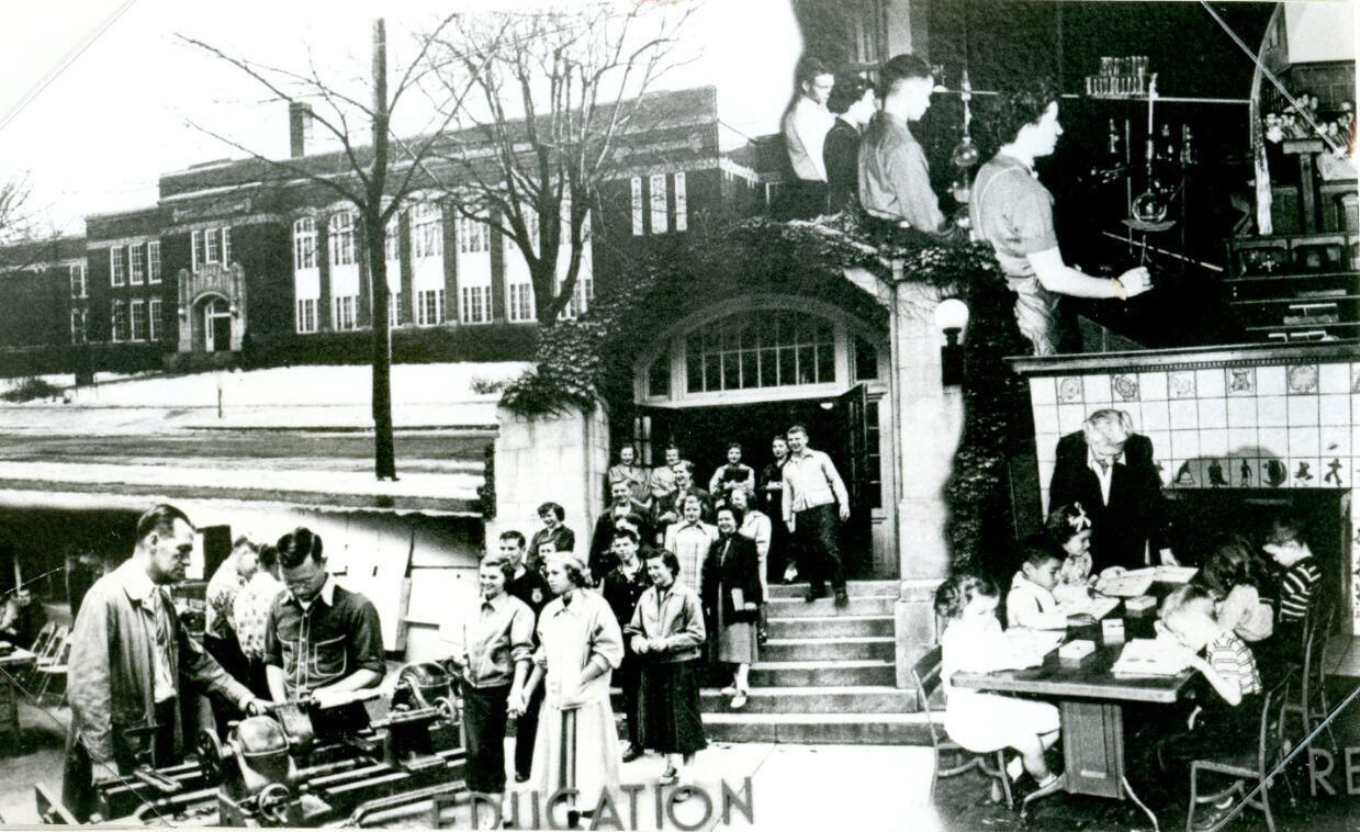 Photo of a mural that once hung in the National Bank Building in St. Johns. It shows Rodney B. Wilson High School and Perrin-Palmer Kindergarten.