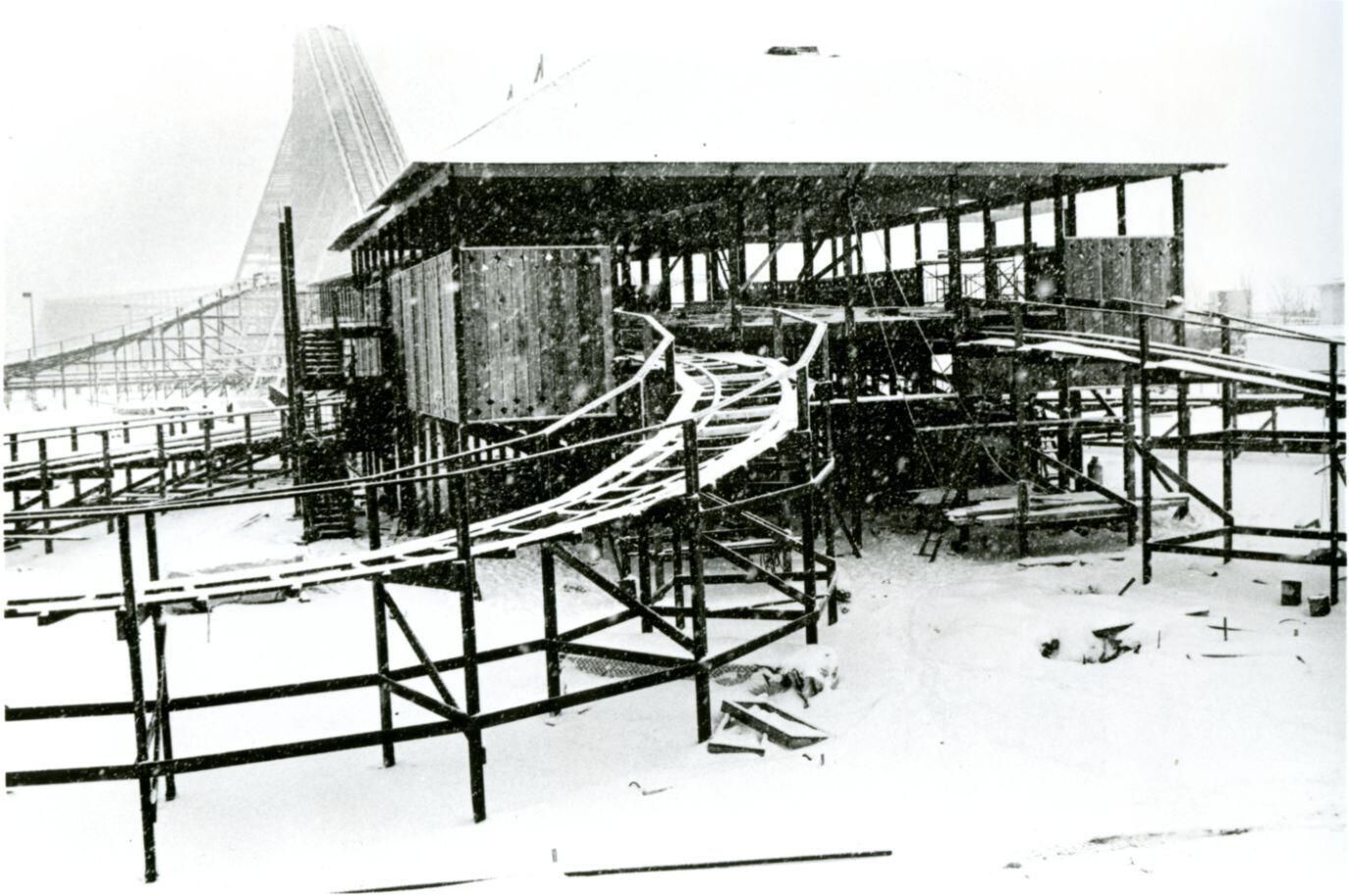 Rollercoaster in winter. Probably Pine Lake (Lake Lansing) Amusement Park.