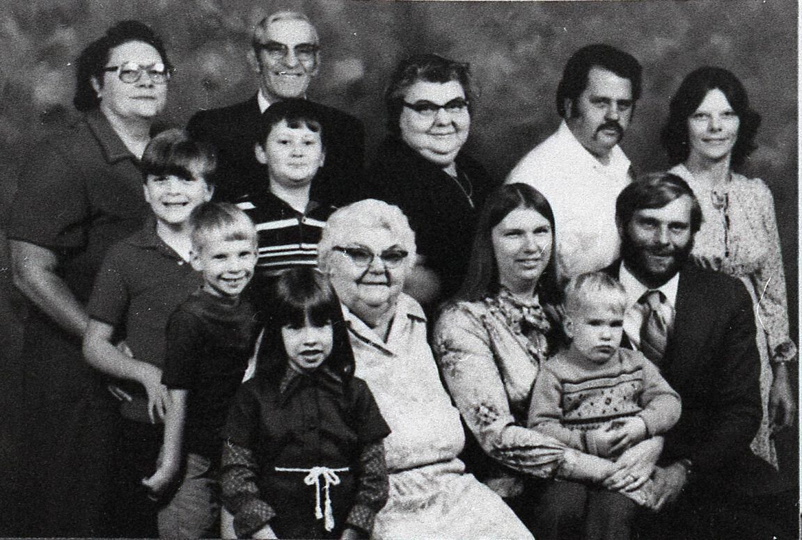 Vera and Charley Rose family, 1979. (back) Pauline and Earle Geagle, Barbara Rose, Gary and Paula Jean Clark, (front) Vera Rose, Bonnie and LeRoy Beagle with Brian, (children) Jeffrey and Kevin Beagle, Scott and Kimberly Clark. Scan of negative from 1980 History of Clinton County page 256.