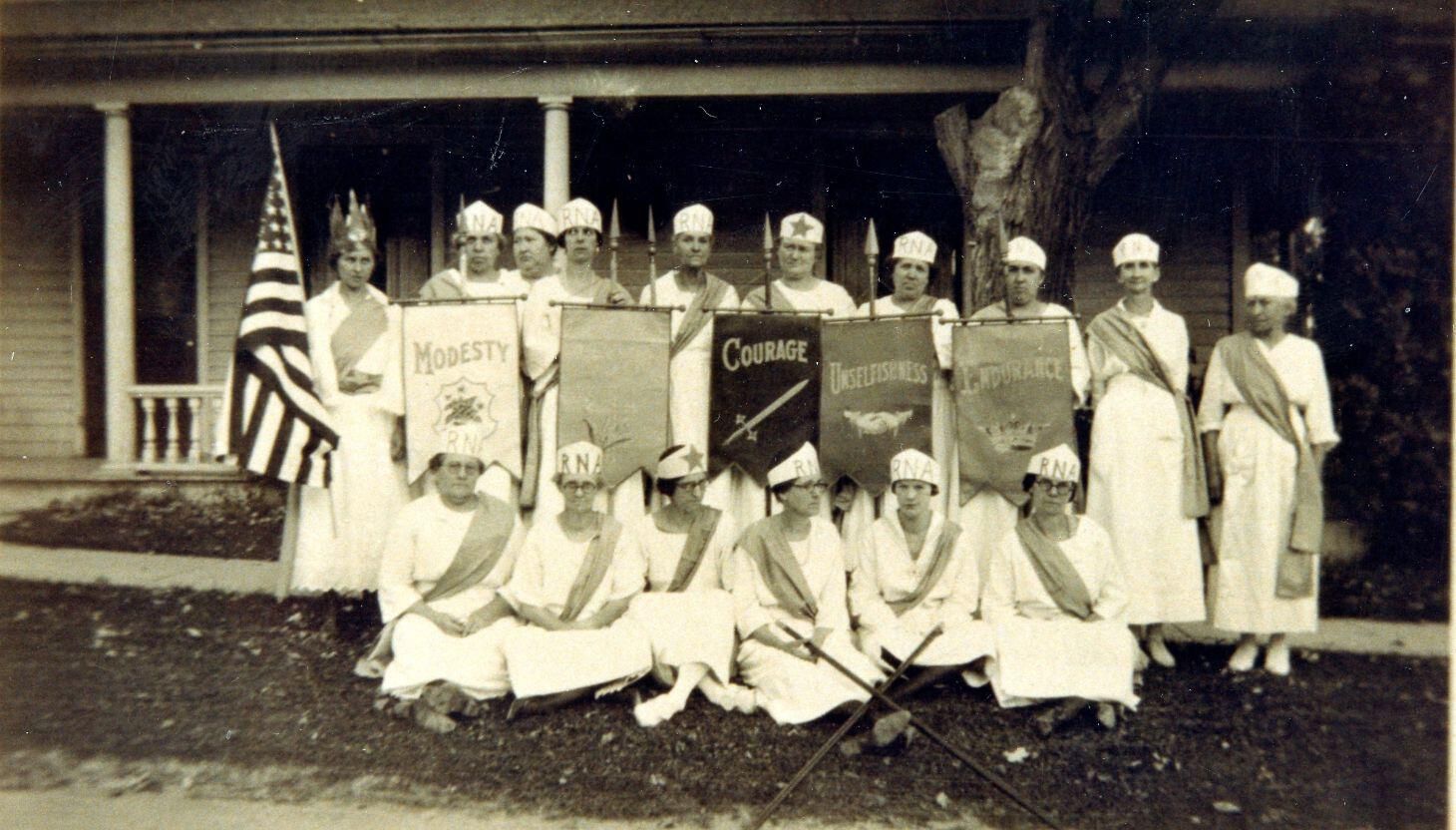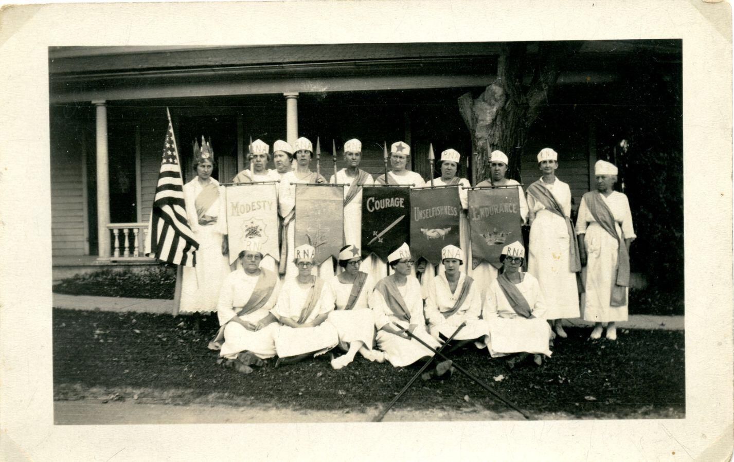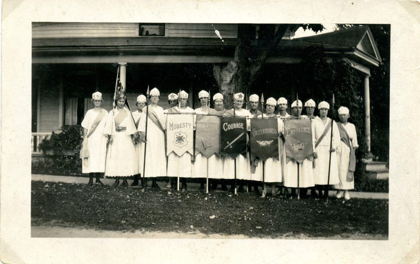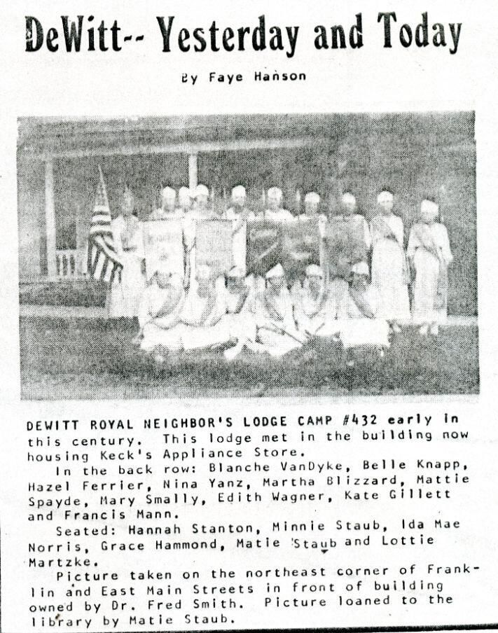 DeWitt Royal Neighbors in front of Judge Hiram Stowell's house (later owned by Dr. Fred Smith). (back) Blanche VanDyke, Belle Knapp, Hazel Farrier, Nina Yanz, Martha Blizzard, Mattie Spayde, Mary Smally, Edith Wager, Kate Gillett, Francis Mann (front) Hannah Stanton, Minnie Staub, Ida Mae Norris, Grace Hammond, Matie Staub, Lottie Martzke. Photo by Mark Norris. (Also M-122)