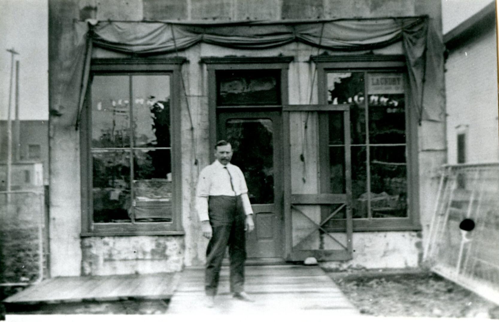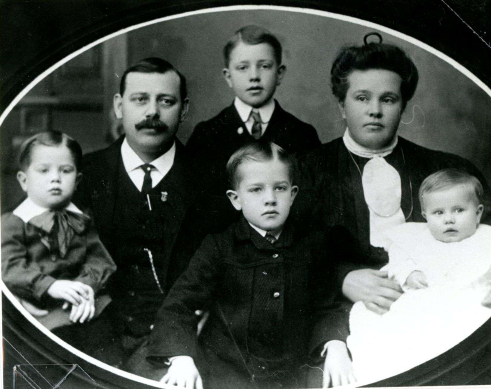 PI108-102 Charles Schoch family. (back) Jay W., Charles Sr., Charles Jr., Hattie, (front) Clyde and Mert. PI108-103 Charles Schoch in front of his barber shop c1915. From 1980 History of Clinton County pages 260-261.