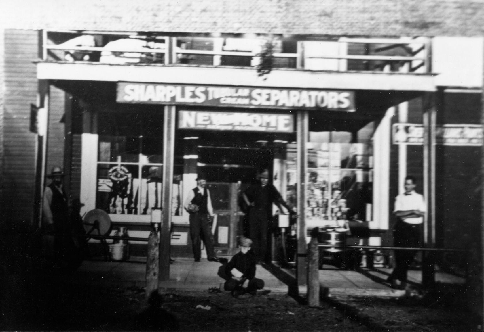 Scott & Linn Hardware – Bert Scott (tall man in doorway), Dyle J. Linn (seated) (copy - original kept by Linn family)