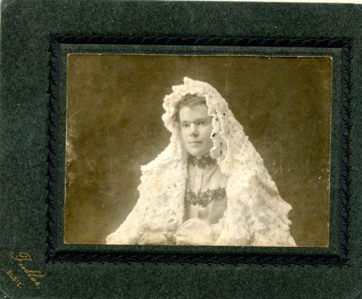 Myra (Higbee) Sheldon with fascinator, c1900. Wife of John Sheldon of Elsie.