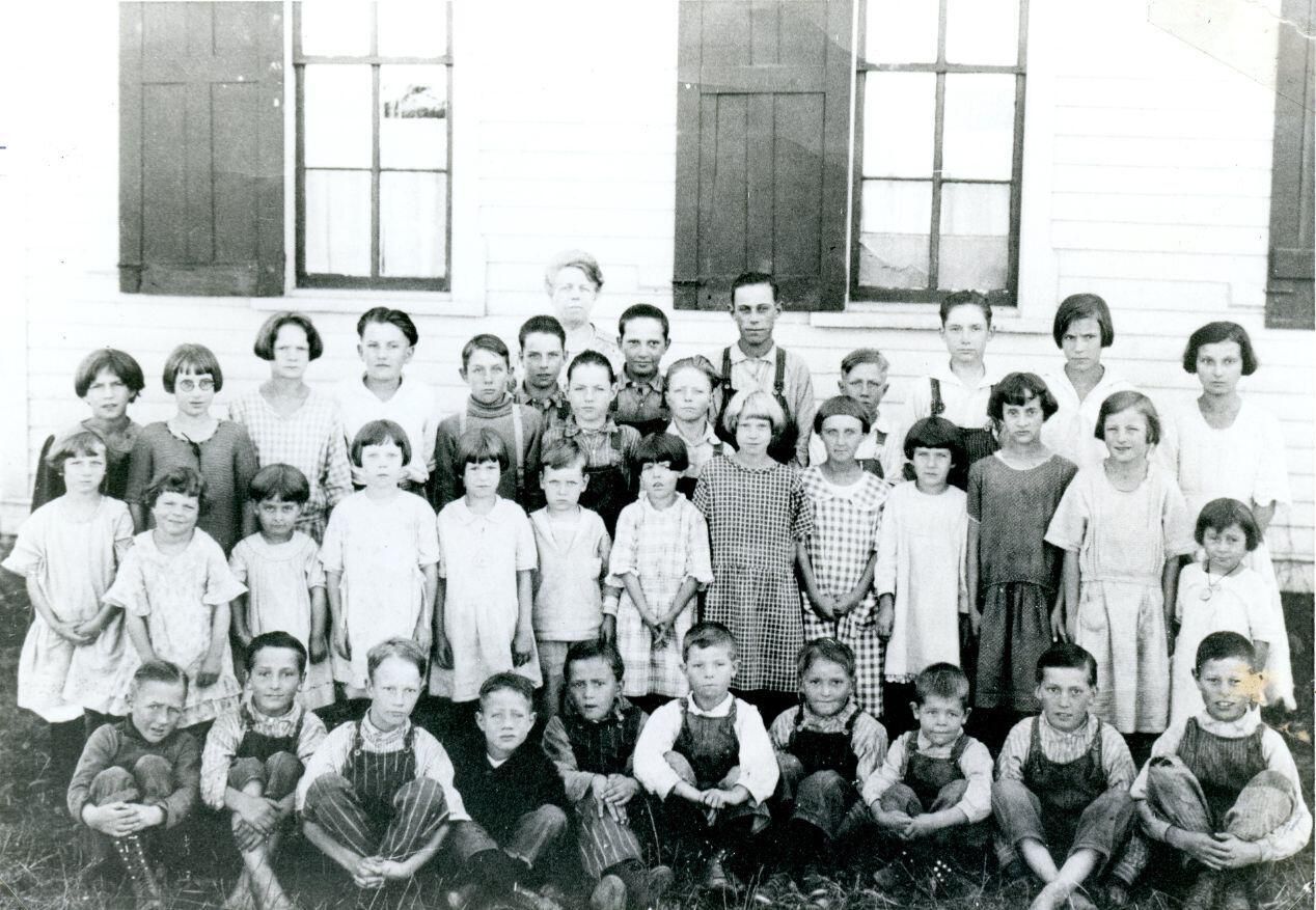 Sherburne School of Ovid Township taken in 1924. Nina Squires (teacher), (front) Victor Sloat, August Tomasek, Charles Wilson, Dick Sloat, Joe Cebeck, Clyde Smith, John Tomasek, Lester Hughson, James Tomasek, Jim Smith, (middle) Betty Wilson, Neva Robinson, Catherine Ring, Mary Myers, Ellen Hinkle, Jack Myers, Gladys Hughson, Virginia Wilson, Mary Cebeck, Alice Carpenter, Florence Saxton, Kathryn, Smith, Neva Smith, (back) Lillian Louth, Majel Swarthout, Marion Louth, Gerald Carpenter, Cayle Sloat, Erwin Miller, Max Miller, Frank Tomasek, Glen Robinson, John Smith, Forest Sloat, Donald Willard, Helena Louth, Anna Tomasek. Copy of photo used in Clinton County History (1980) page 668.