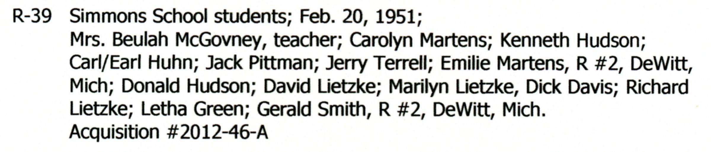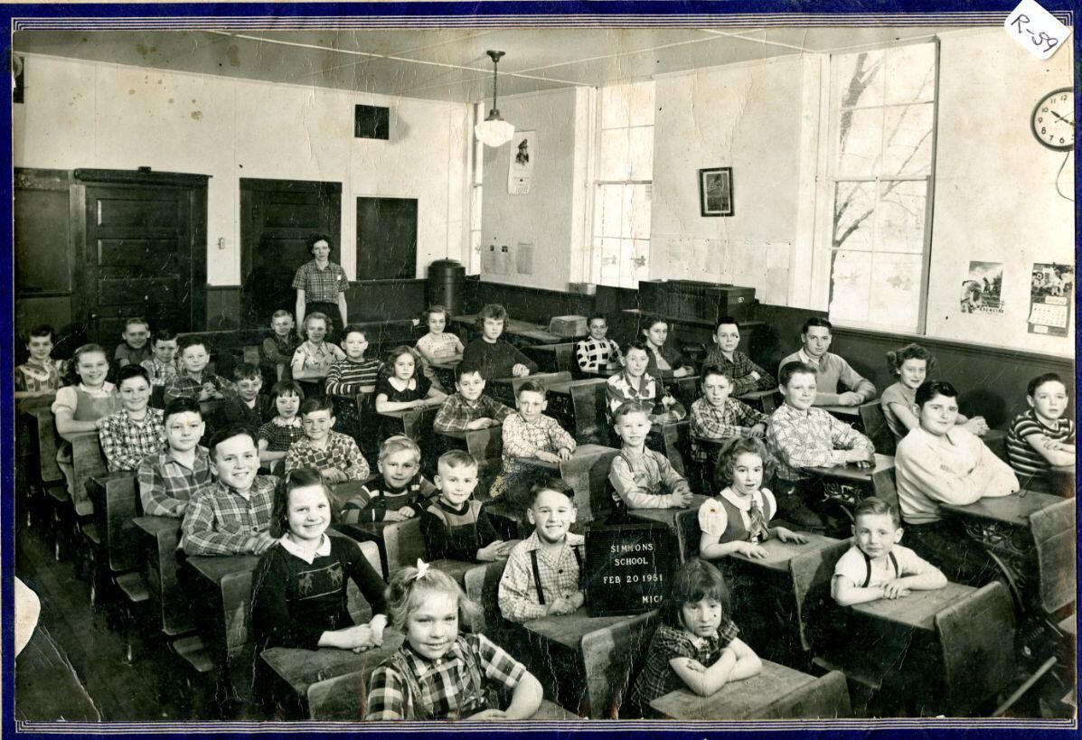 Simmons School, Riley Township, February 20, 1951. Beulah McGovney (teacher).