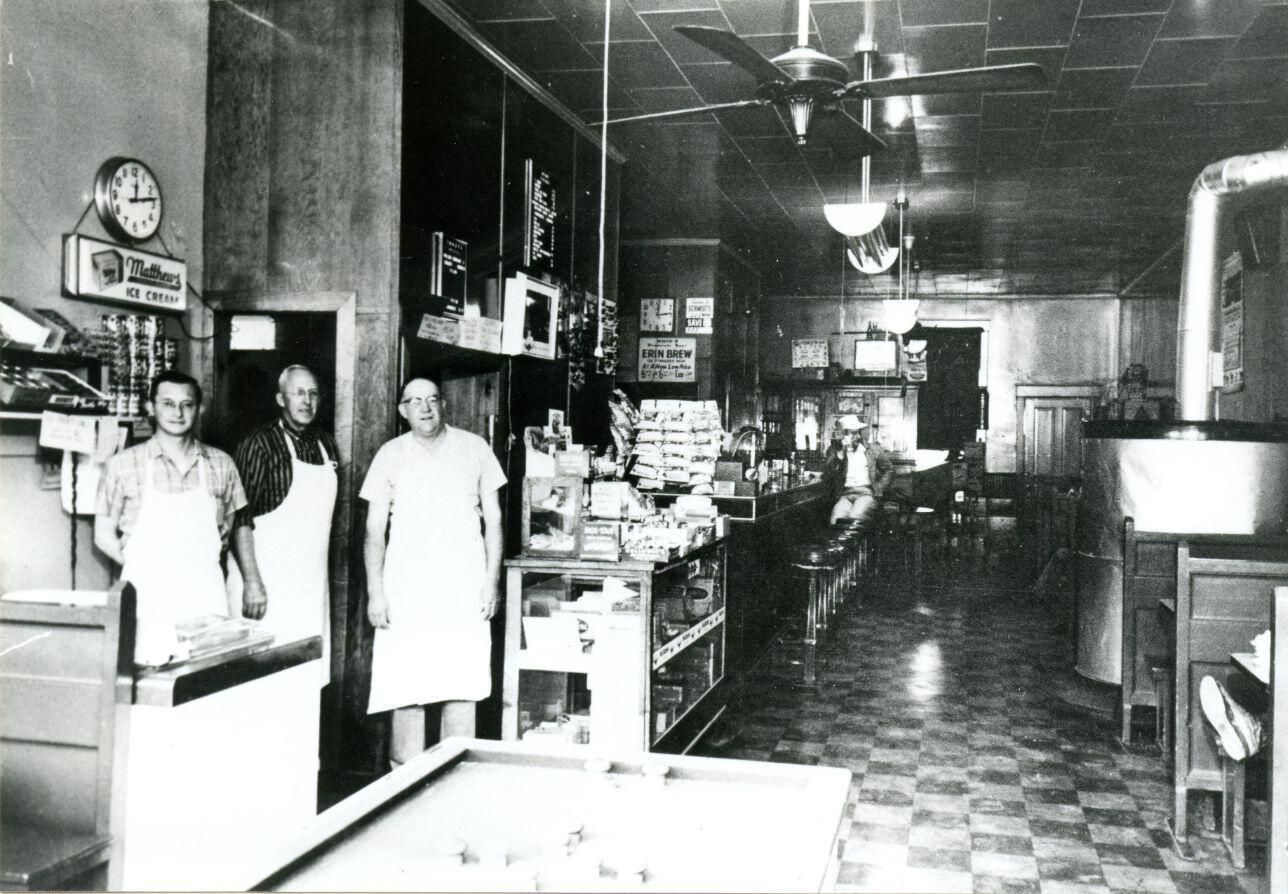 Simon's Restaurant, Fowler, Michigan, early 1950's. Pictured are (l to r) Clarence Simon, Arnold Miller, and Henry Welder. Copy of photo used in Clinton County History (1980) page 727. 2nd copy PI216-14.