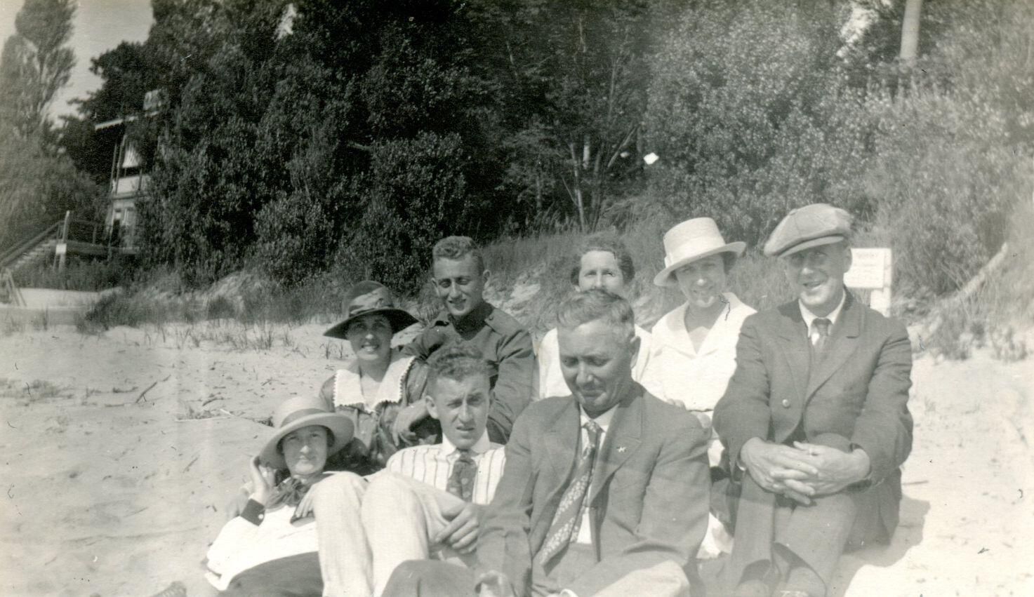 (back) Ruth, Rex, Grandma Sirrine, Aunt B., Al, (front) Alberta and Norman Simpson, Grandpa Charles Sirrine. At beach.