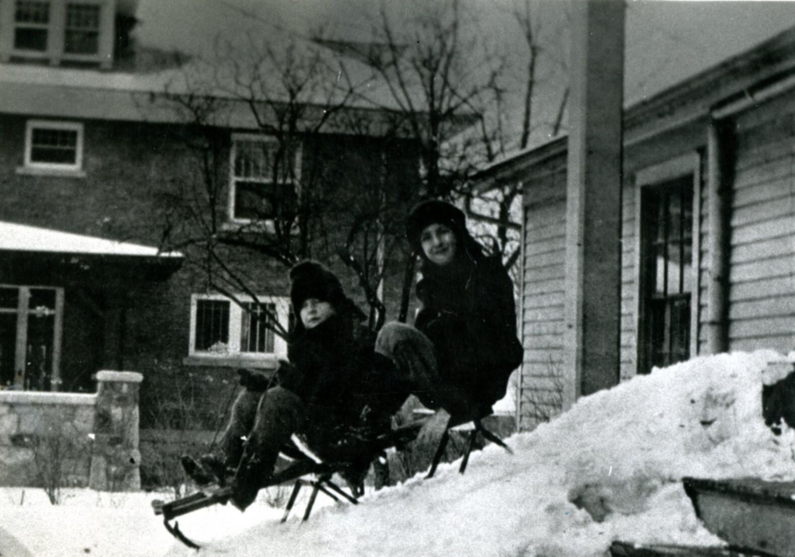 Two boys, friends of Rodney B. Wilson, sledding in St. Johns.