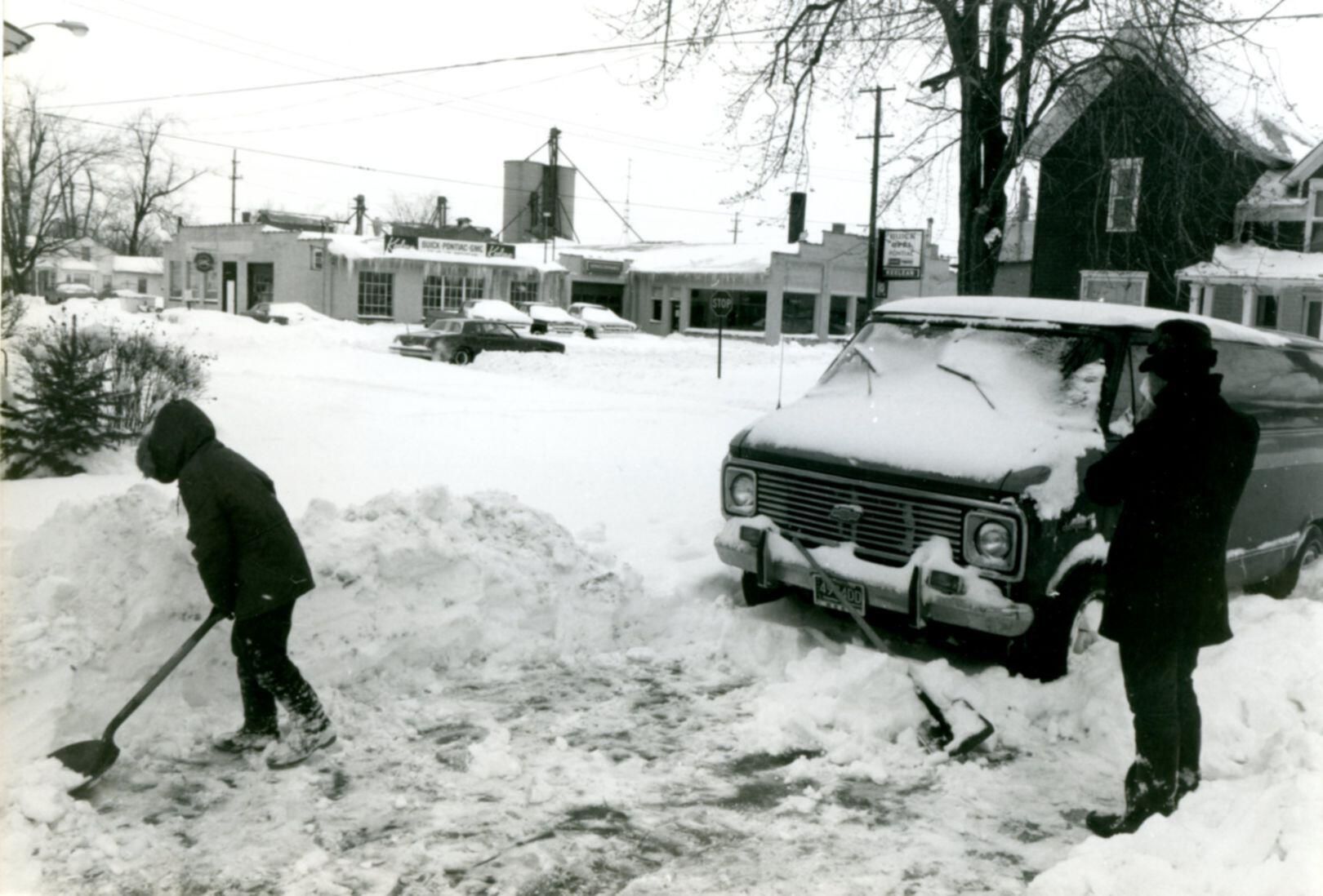Digging out from 1978 blizzard in St. Johns with Keelean Buick-Pontiac-GMC in background.