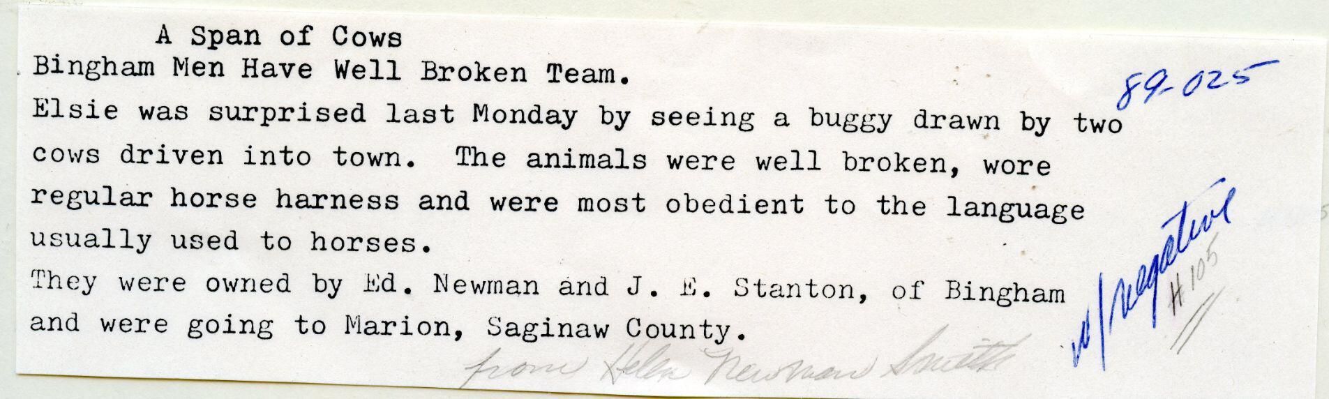 Photo taken in Elsie, Michigan, on way to Marion, Saginaw County. Cows owned by Ed Newman and J. E. Stanton of Bingham Township. (M-14 is a photocopy)
