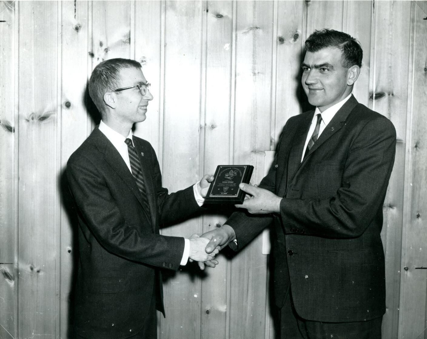 Ronald Spitzley receiving award for Outstanding Young Farmer in 1963. Presenter unidentified.