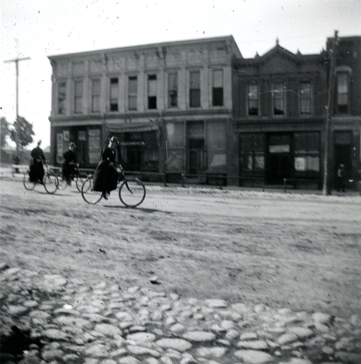 Bikers riding a side street in St. Johns. Print from glass negative.