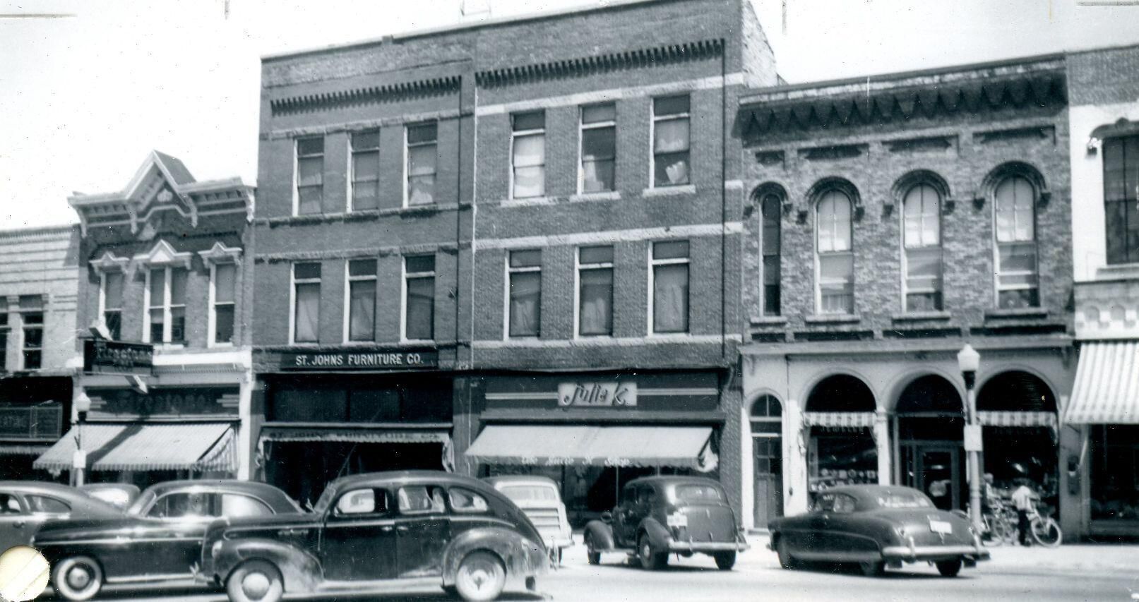St. Johns Furniture Co. (south part built by John Paine in the 1860's) and Julie K Store. Taken June 1950, St. Johns, Michigan.