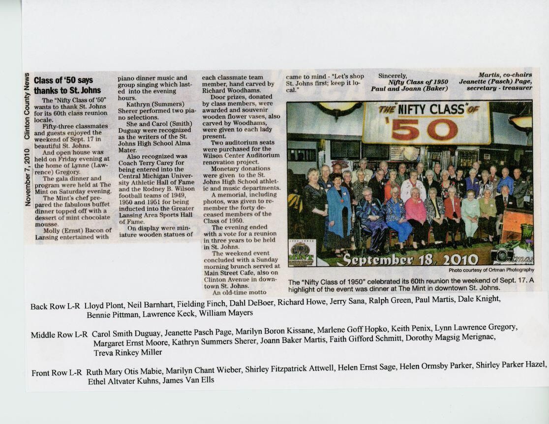 Reunion of class of 1950, St. Johns. newspaper clipping