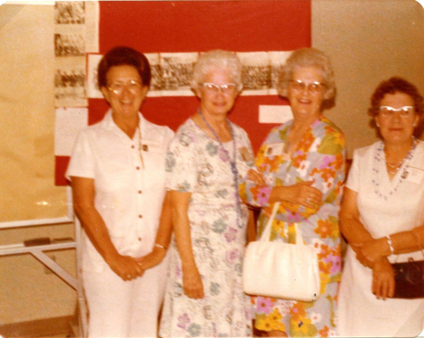 St. Johns High School class of 1927 50th reunion in June 1977. Helen (Reed) Spayde, Mildred (Locher) Kowalk, Eleanor (Moon) McKinney, Nina (White) Adams.