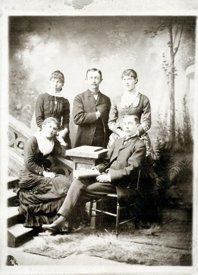 St. Johns High School 1882 graduating class. (back) Sara M. Pouch, Wilbur Clarence Wright, Louisa Eliza Cook, (front) Ida May (Lyon) Fildew, Frank Vauconsant. photocopy