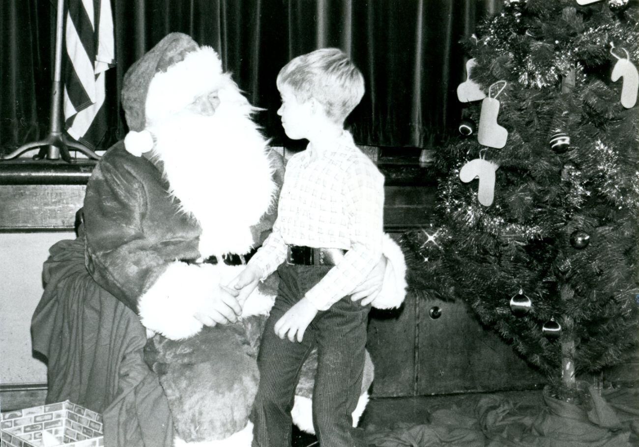 Charlie Langlois talks to Santa at Christmas 1978 Jaycettes' Lunch with Santa. Copy of photo used in Clinton County History (1980) page 631.