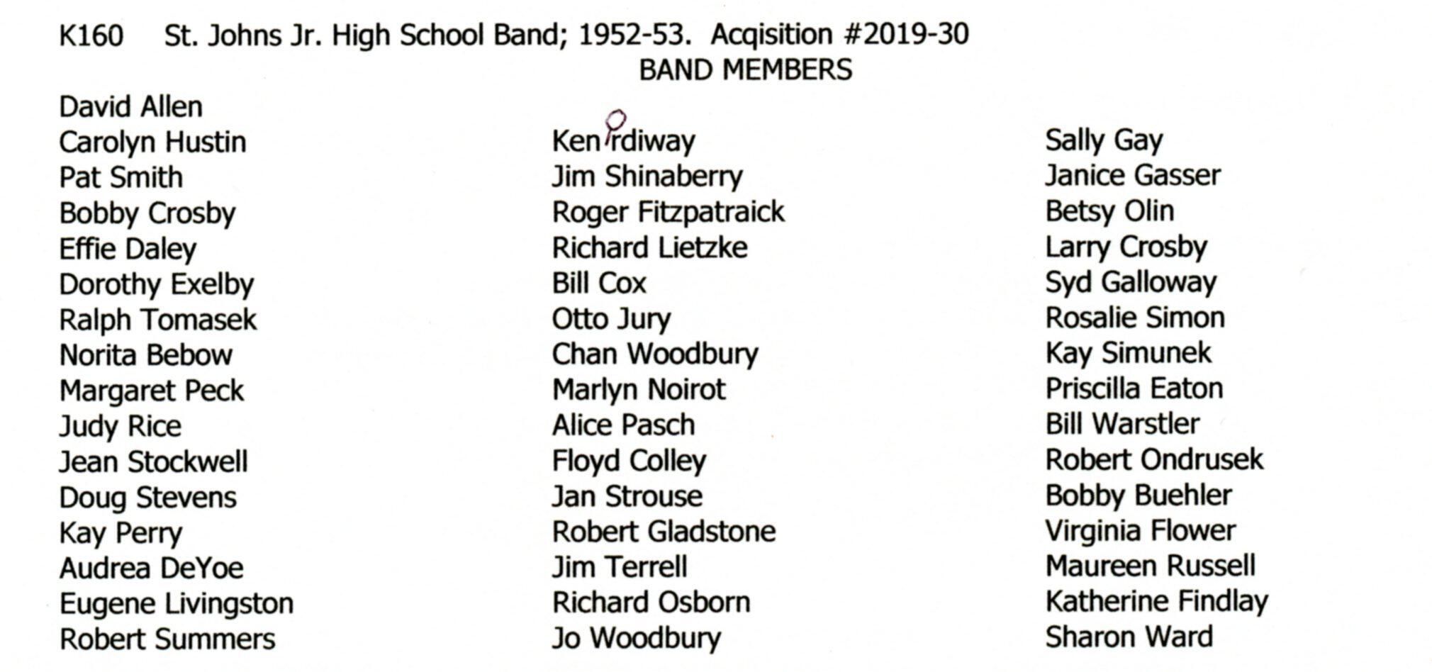 St. Johns Junior High Band 1952-3.
