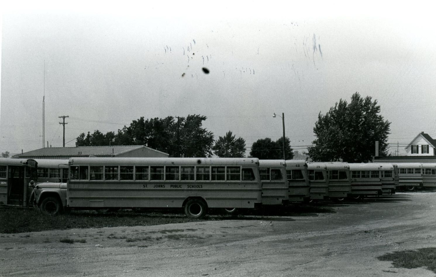 Bus fleet of St. Johns School on State Street west of Morton. Copy of photo used in Clinton County History (1980) page 642/