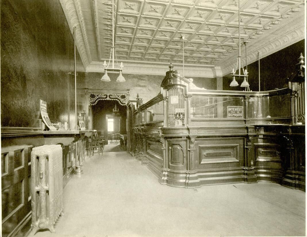 State Bank of St. Johns interior. Likely taken in 1894, 1900 or 1906 based on calendar in photo.