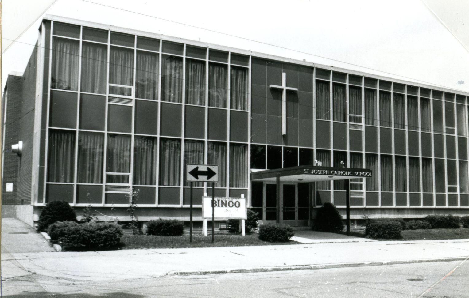 St. Joseph School building, St. Johns, Michigan c1979. Copy of photo used in Clinton County History (1980) page 664. Additional copy PI212-167.
