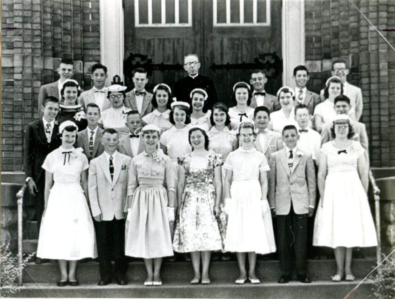 St. Joseph School, St. Johns, Michigan, 1957 8th grade graduation. (back) Jack Martin, Tom Irrer, Michael Palmer, Father Justin Hermes, Dennis Bauer, Tom Zimmerman, Ronald Higgins, (3rd row) Karen Rehmann, Joyce Thelen, Barbara Bohil, Margaret Barner, Frances Sucheweski, Kathleen Lannon, Lois Huggett, (2nd row) Louis Wilson, Richard Brown, Bill Irrer, Korean King, Betty Henning, Bill Smith, Dennis Penney, Richard Ladisky, (front) Janice Pattison, Rex Ernst, Mary Lou Ochis, Maureen Ley, Ruth Ann Moggenberg, Dennis Koenigschnecht, Galye Jorae. Copy of photo used in Clinton County History (1980) page 664.