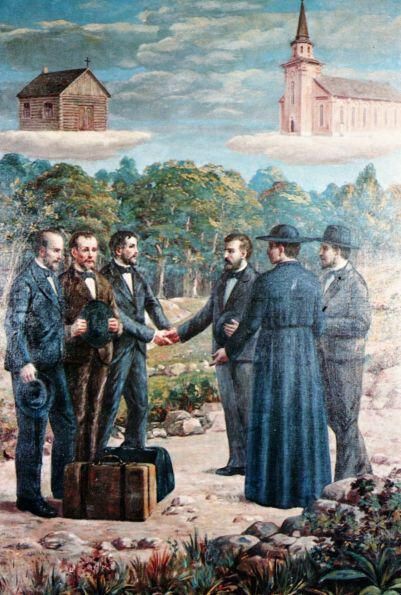 Westphalia Historical Society postcard. The founding fathers of St. Mary's by G. Zomboni, commissioned in 1936 by Father Edward Gutha (fair use thumbnail)