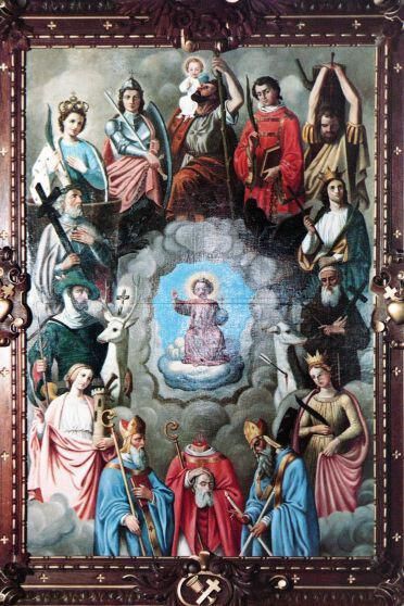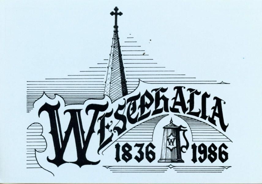 Westphalia Historical Society postcards. Post129 are the 14 Holy Helpers. Post130 is Sesquicentennial postcard. (fair use thumbnails)