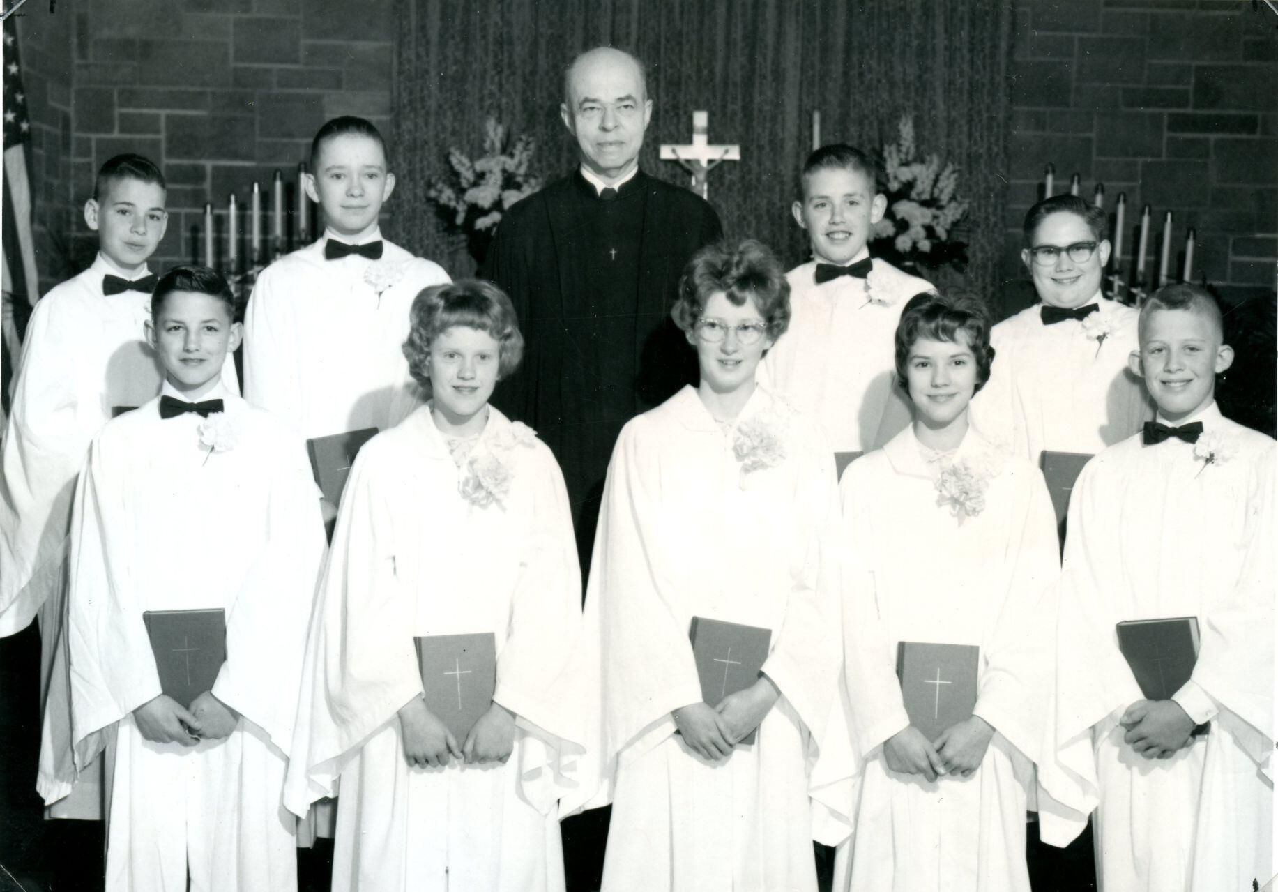 St. Paul Lutheran Church, Fowler, Michigan, March 22, 1964. (back) David Charles Sillman, Paul Eugene Fox, Rev. Herbert T. Schmitt, Steven Walter Nobis, Curtis Lee Swanson, (front) Forest Reginald Conley III, Diane Carol Boak Thurston, Judy Ann Benjamin Fraser, Kaye Marie Swanson, Jeffrey Witt Nobis.