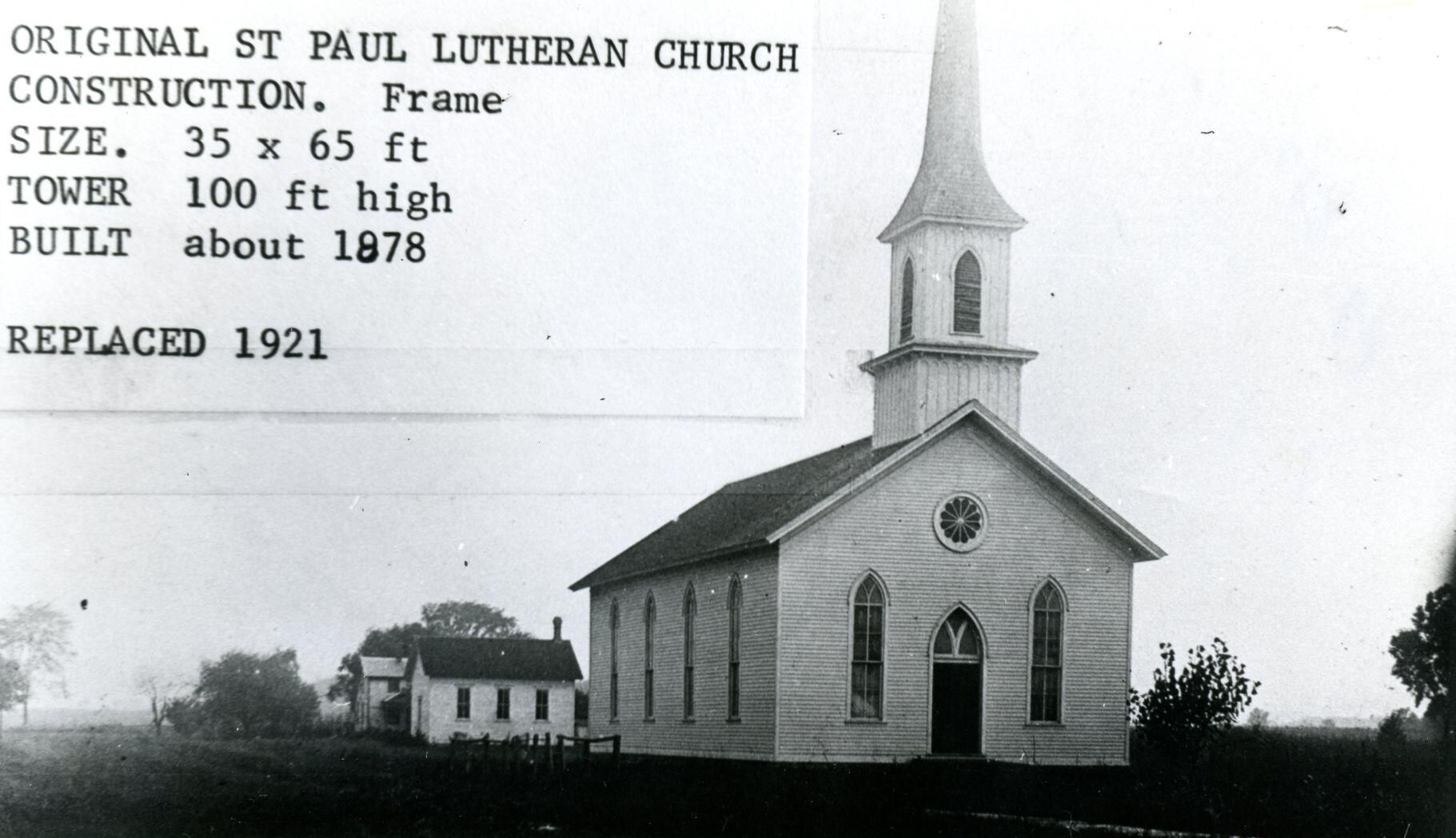 Original frame building of St. Paul Lutheran Church of Fowler which was built in 1878 and replaced in 1921. Copy of photo used in Clinton County History (1980) page 582. Original owned by Joan Bancroft.