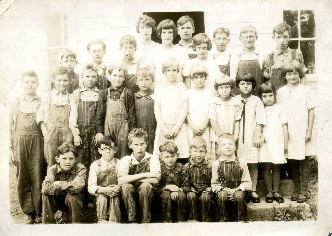 Stafford School, Duplain Township, c1927. Hettinger (teacher), Ilene Welter, Helen Stephens, John Panik, Orson Bailey, Burton Tabor, Opal Bashore, Paul Peterson, Steve Panik, Gordon Bailey, George Manning, James West, Keith Setterington, Helen Setterington, May Bashore, Margaret Bailey, Albertine Bailey, Margaret Kutney, Steve Kutney, Floyd Peterson, Lawrence Peterson.