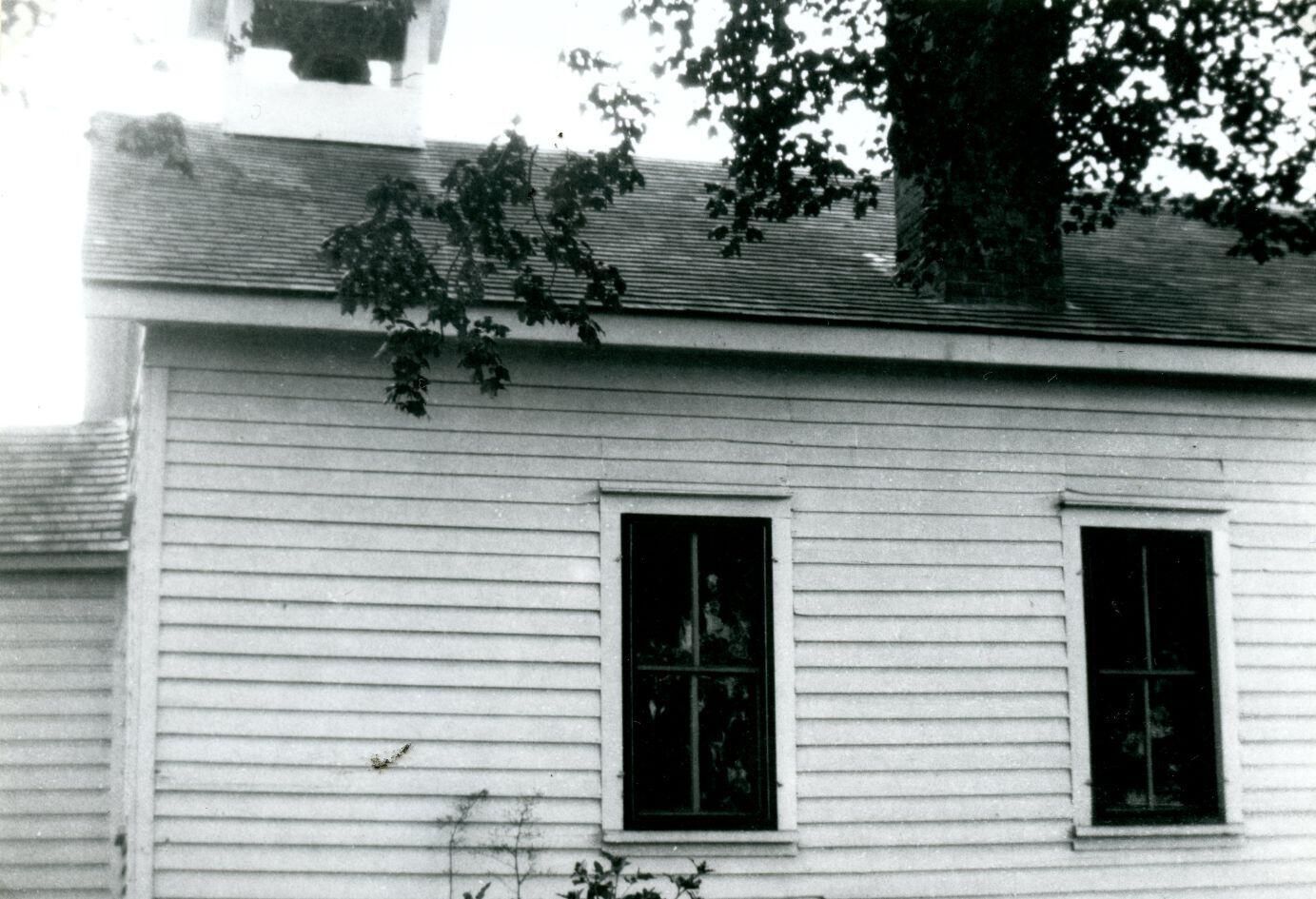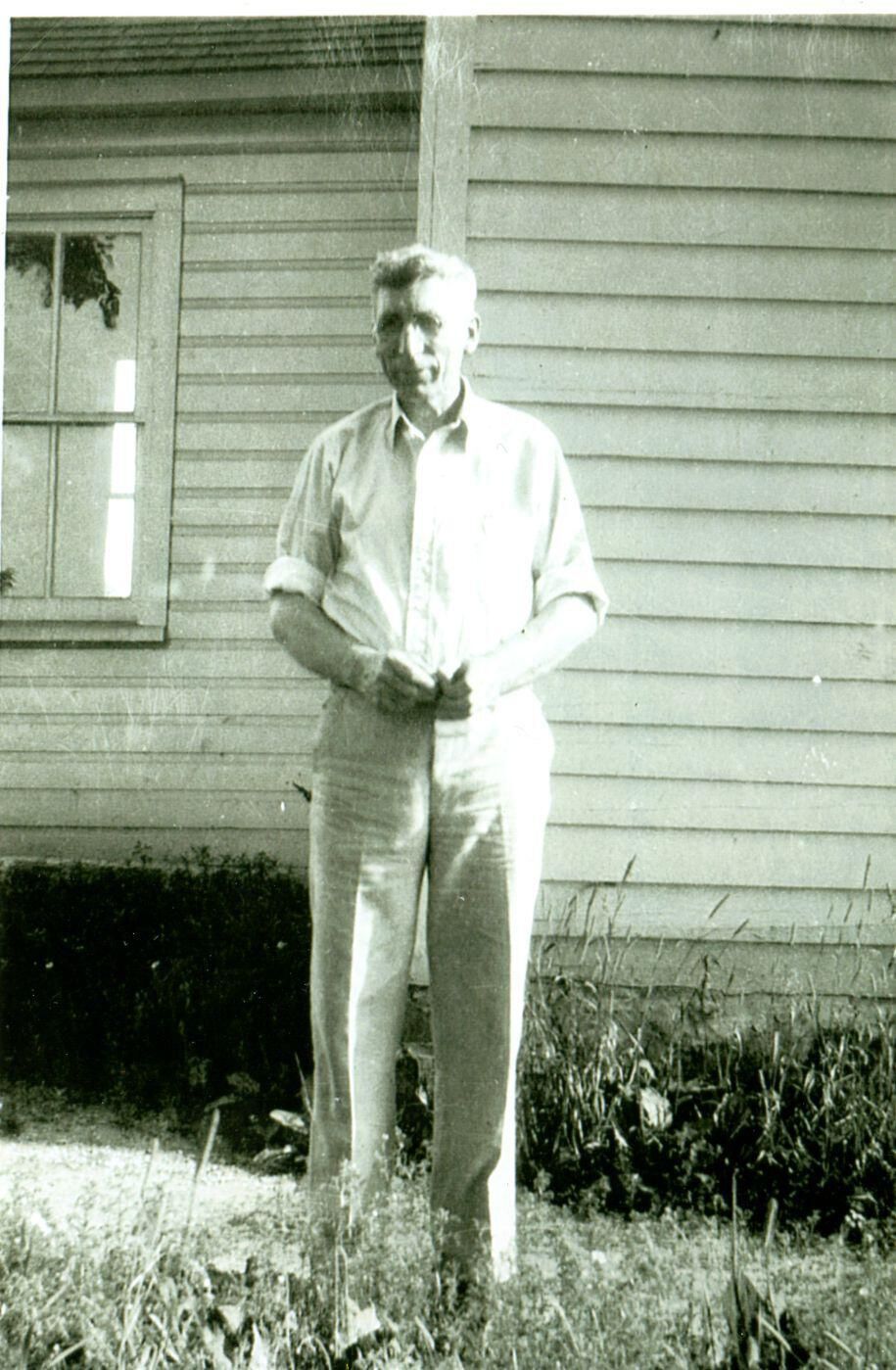 Former teacher Archie Monroe Newman standing in front of the Stafford School, Duplain Township.